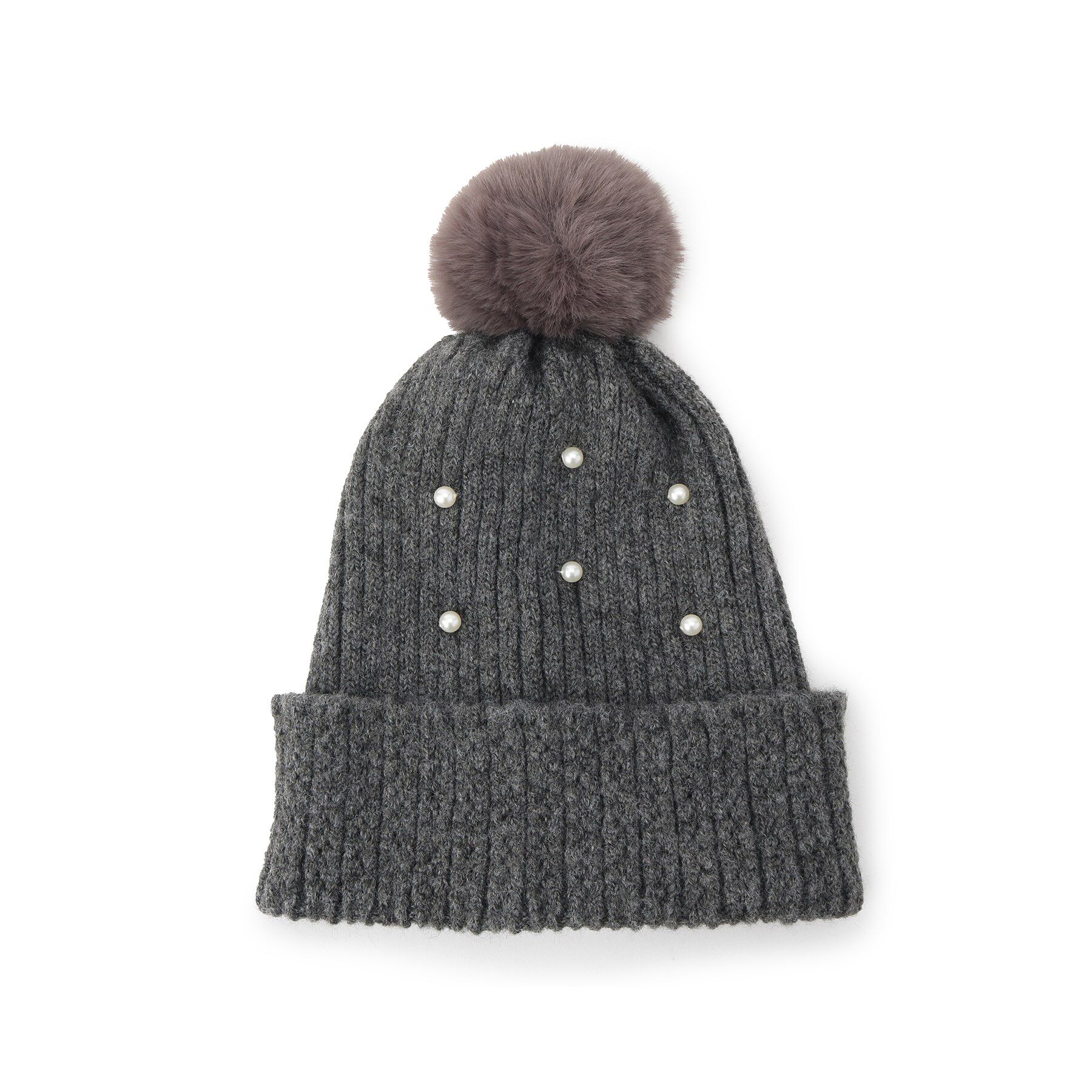 【デザイン】なめらかファーのポンポンが付いたニット帽。柔らかい風合いのファー×ニットで可愛らしい印象に♪フロント部分にフェイクパールを散りばめたトレン.. |