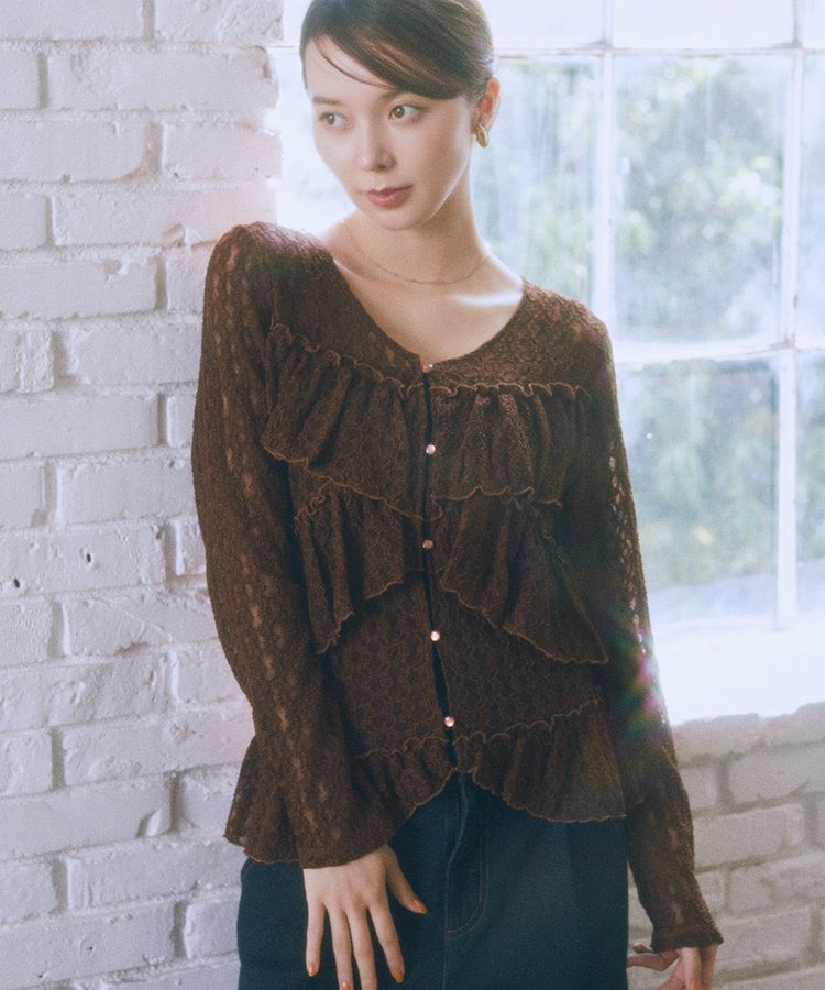 繊細な編みディテールで仕立てた華やかさのあるカーディガン。表面感のあるレースの優しい雰囲気にフリルアクセントを加えたフェミニンなデザインです。ソフト.. |