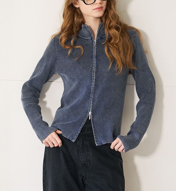【Design】ピグメントダイのヴィンテージ感が高見えするハイネックニットカーデ。上下どちらからでも開くWジップは、開け具合で女性らしいヘルシーな着こなし.. |