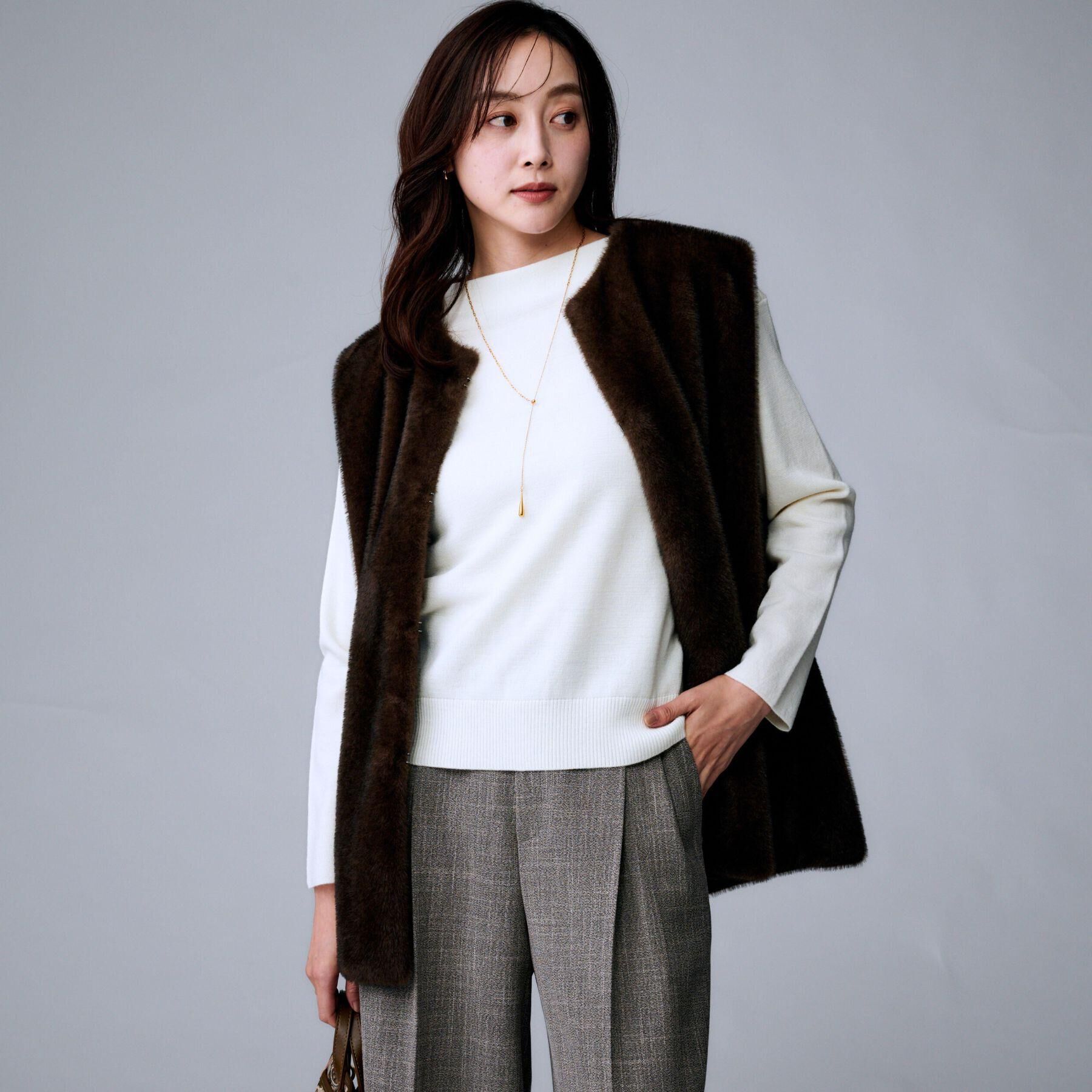 【デザイン】温かさとトレンドを両立させたミディ丈のフェイクファーベスト、ラグジュアリーな雰囲気がコーディネートに華やかさを加え、今年らしいスタイルに.. |