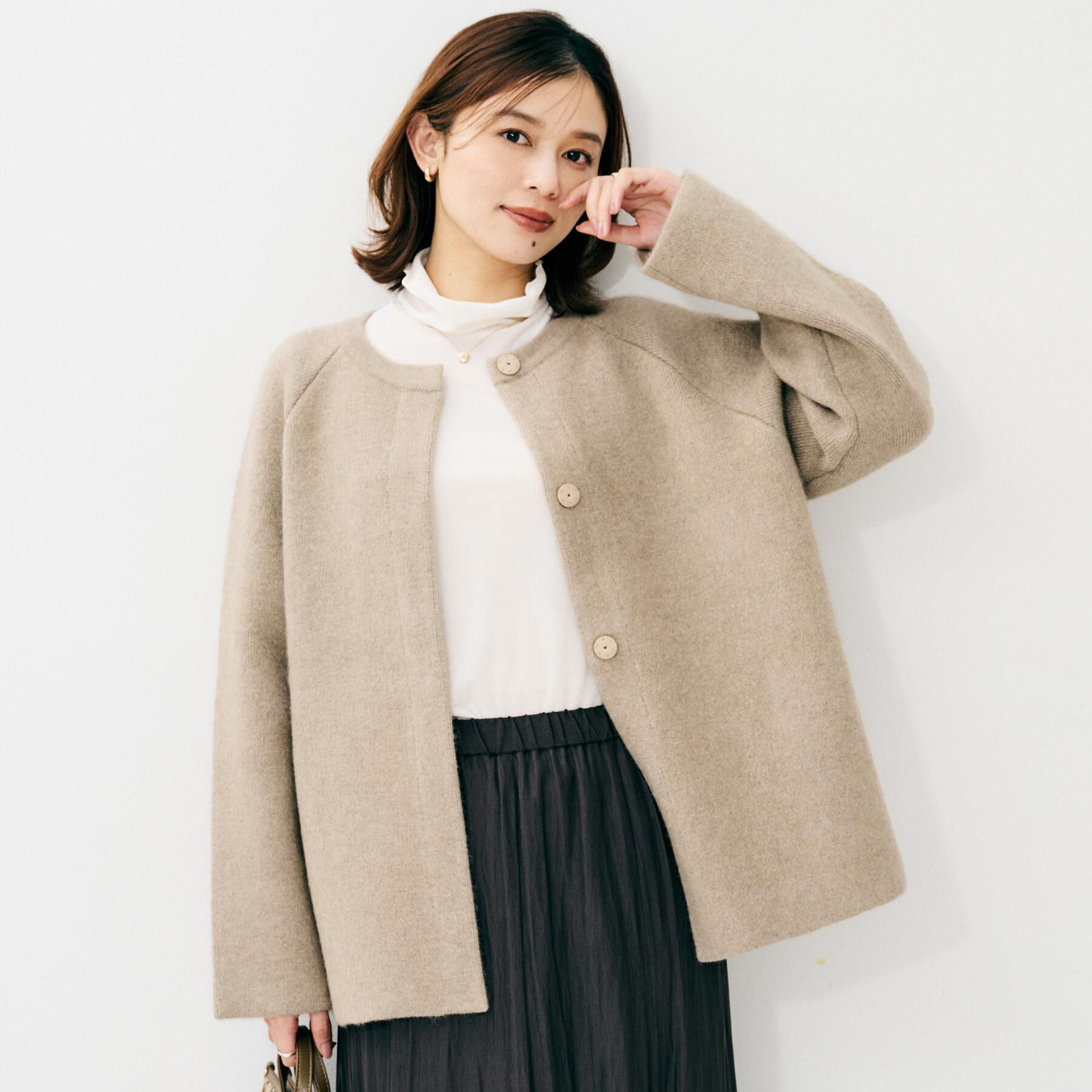【デザイン】カーディガン以上、コート未満の絶妙なバランスで仕立てられた軽いニットアウター。表側に毛足のあるウール、裏側にポリエステルを使用し、ふわっ.. |
