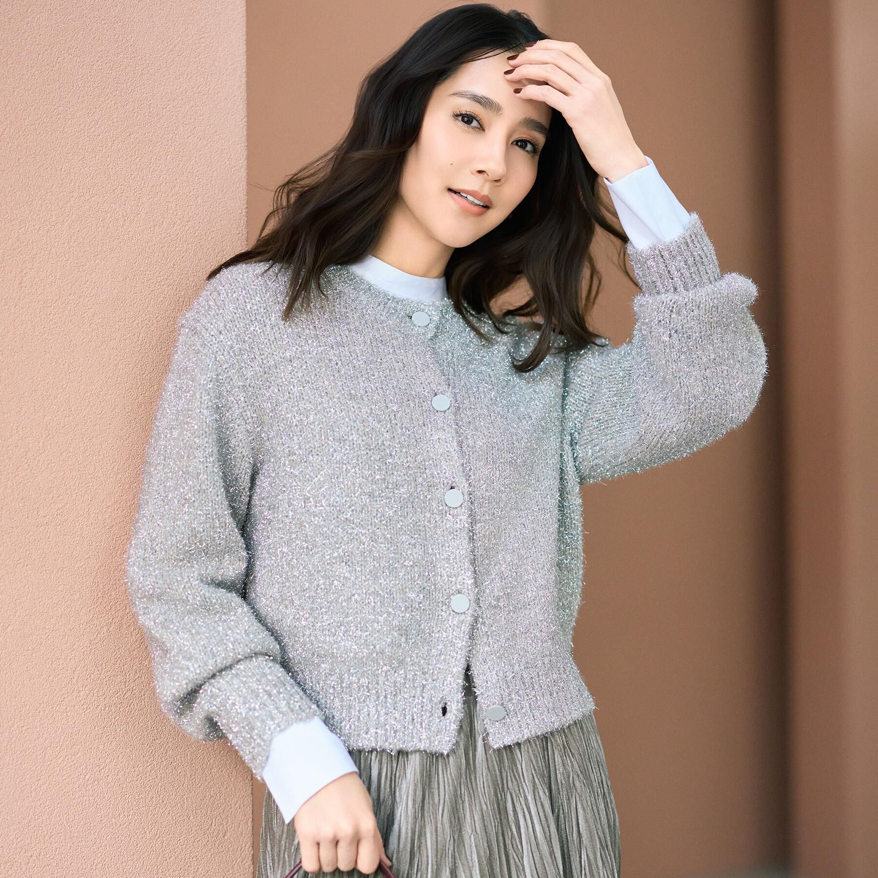 【デザイン】軽やかさとふくらみのあるファンシーヤーンを使用したメタリックなラメの光沢感を持つ華やかなカーディガン。良質感ある塗装釦がシンプルなデザイ.. |