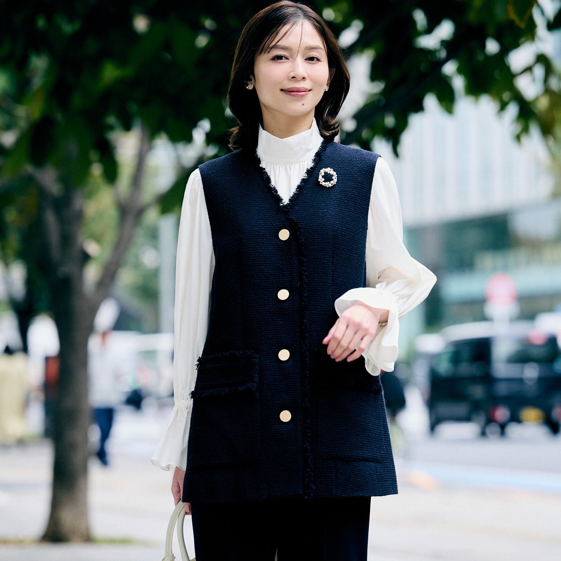 【デザイン】軽やかなスラブツイード素材を用いたミディ丈のジレは首元をシャープに見せるカラーレスデザイン。インナーを引き立て縦長ラインが強調されること.. |