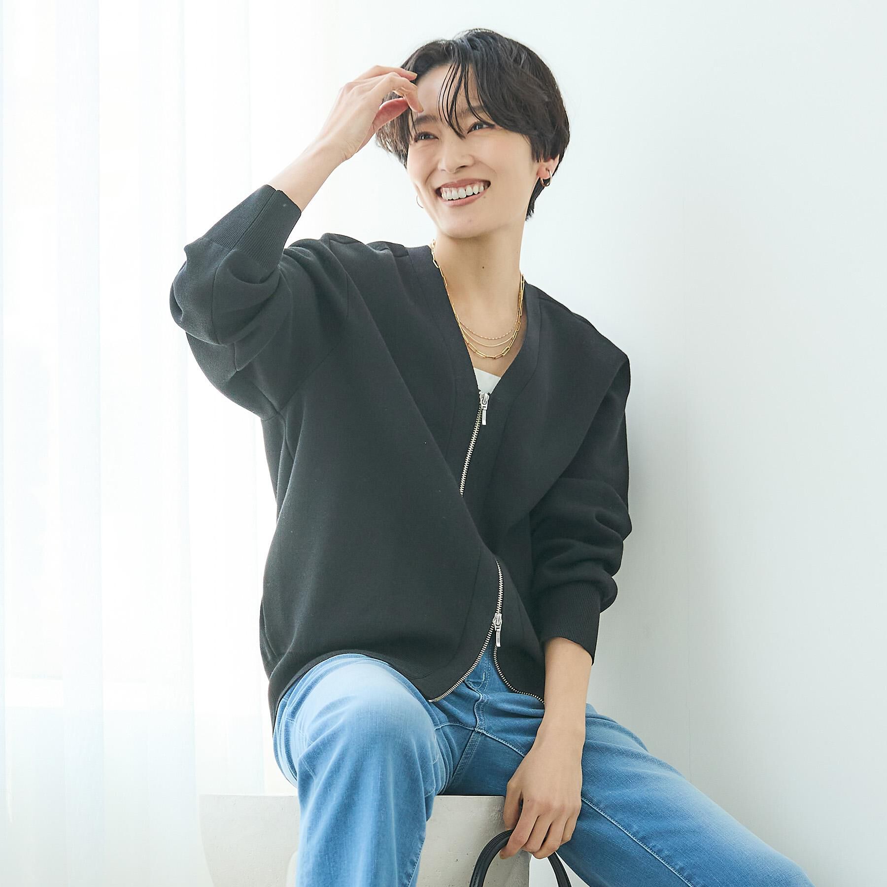 【デザイン】冬の余韻が残りつつも春の兆しを感じる季節にぴったりの、ジップアップのアウターニットカーディガン。軽く中肉の厚みで程よいハリ感を持つ素材は.. |