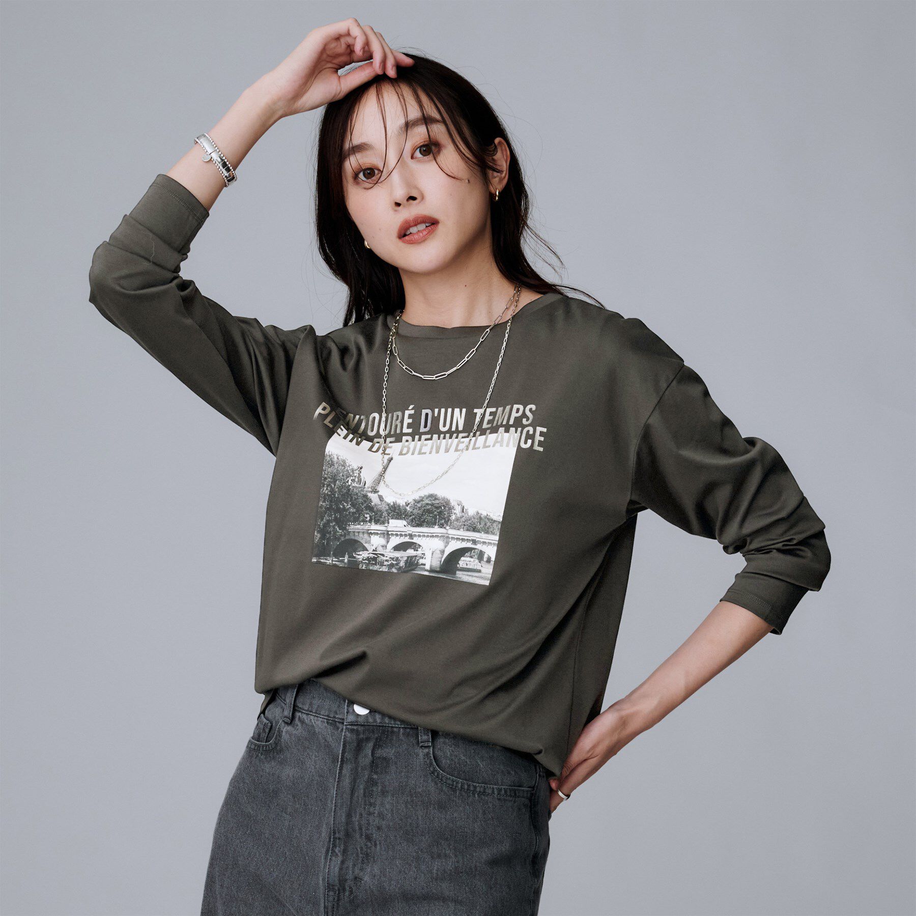 【デザイン】フォト+箔プリントデザインのグラフィックロンT。ジャケットのインナー等、あると便利な一枚。さりげなく光る箔プリントがコーデのアクセントに.. |
