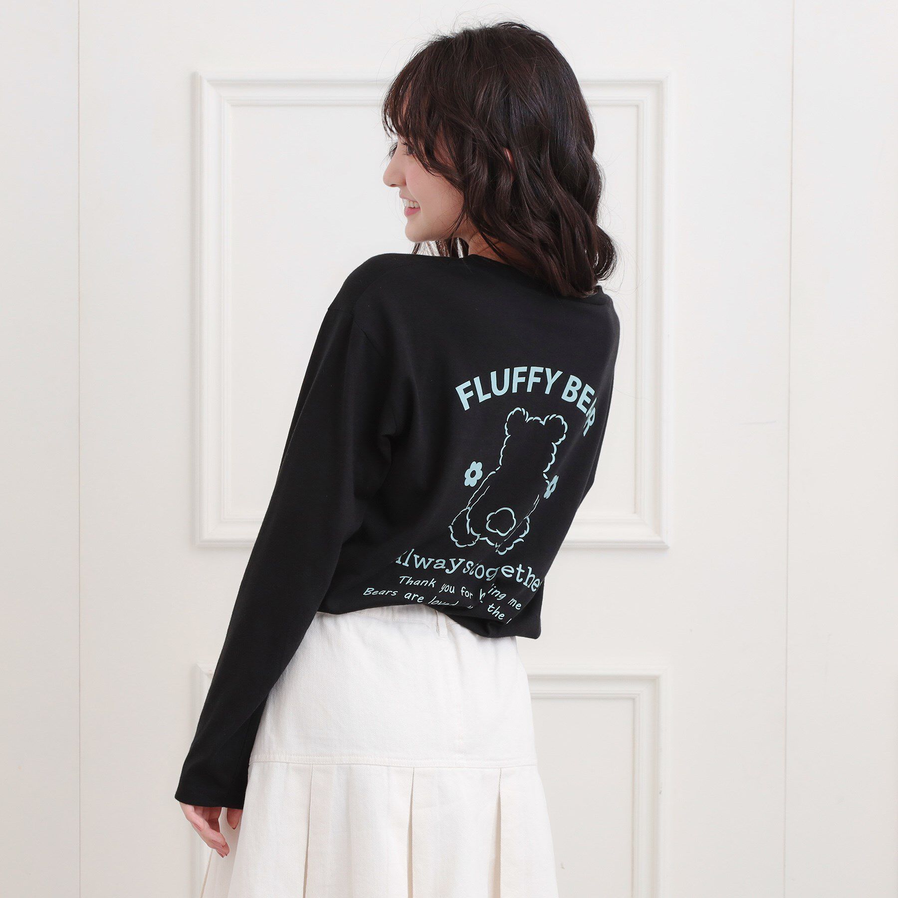 【デザイン】ピンクラテ定番のくまちゃんロンT。背中に大きく入ったくまちゃんとお花のプリントが可愛いポイント♪【素材】サラッとした肌触りのコットン混素材.. |