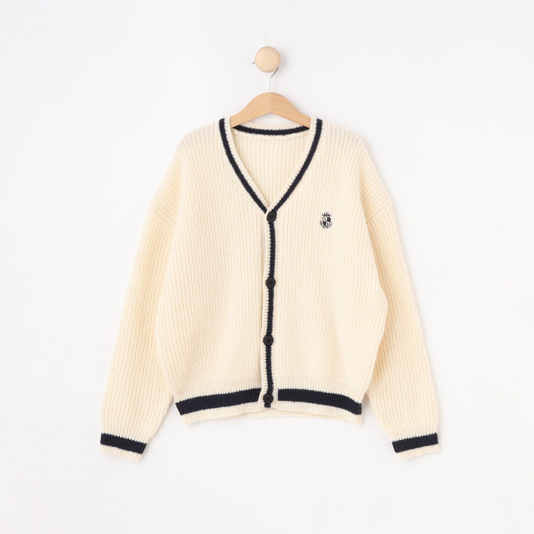 【プチセレ】普段使いもできるきちんと服、プチセレモニーシリーズです。【デザイン】配色のライン使いや胸元の刺繍がポイントになったニットカーディガンです.. |