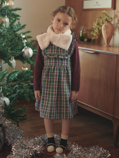 ヨーク部分にあしらったフリルが愛らしいチェック柄ジャンバースカート。広がりすぎないシルエットで、動きやすく上品な印象に仕上げました。カットソーやブラ.. |