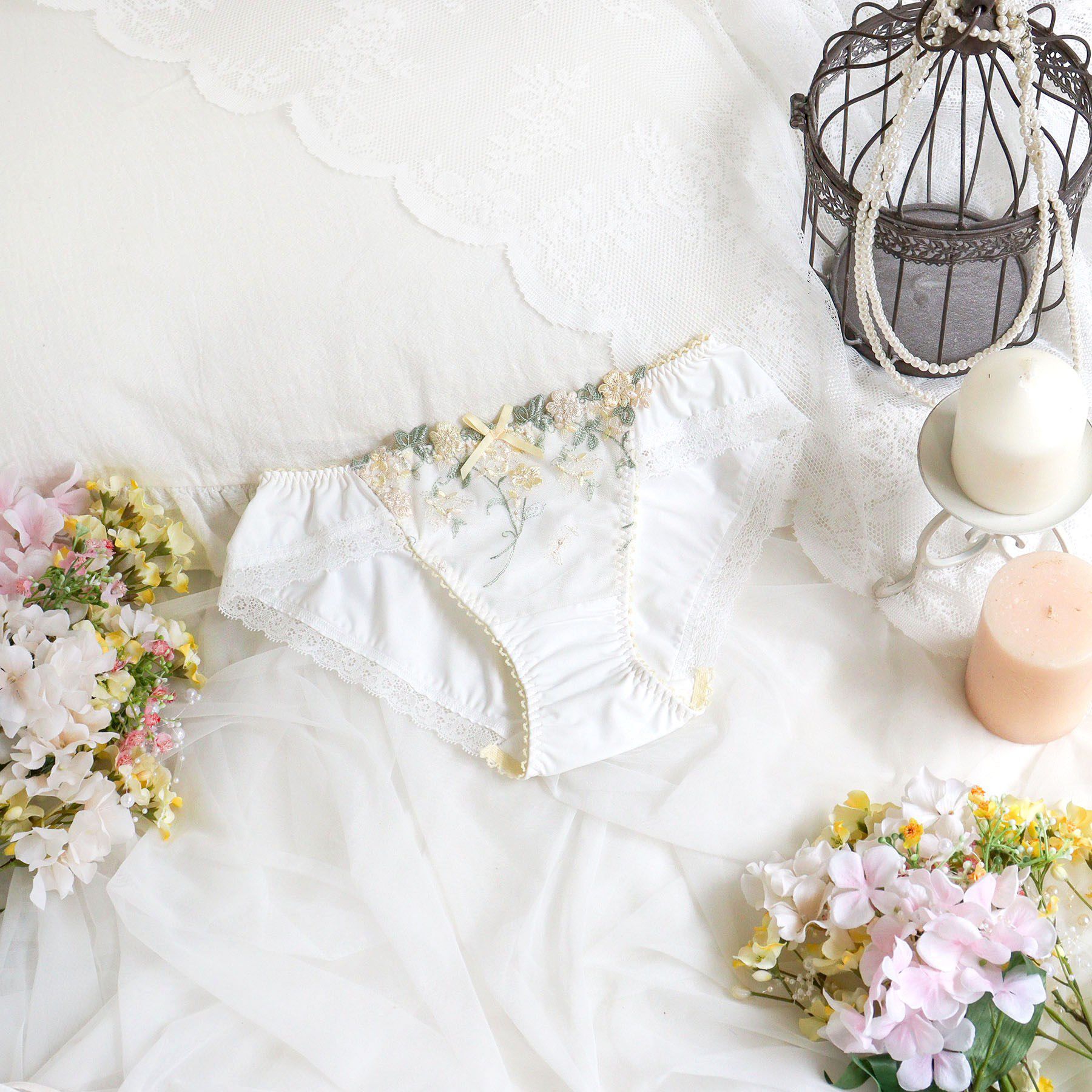 【軽やかに舞う花びらのきらめき】ひらりと舞う花びらをイメージした、エアリーなシリーズです。ラフなタッチで刺しゅうされた花々が重なり合うレースは、あえ.. |
