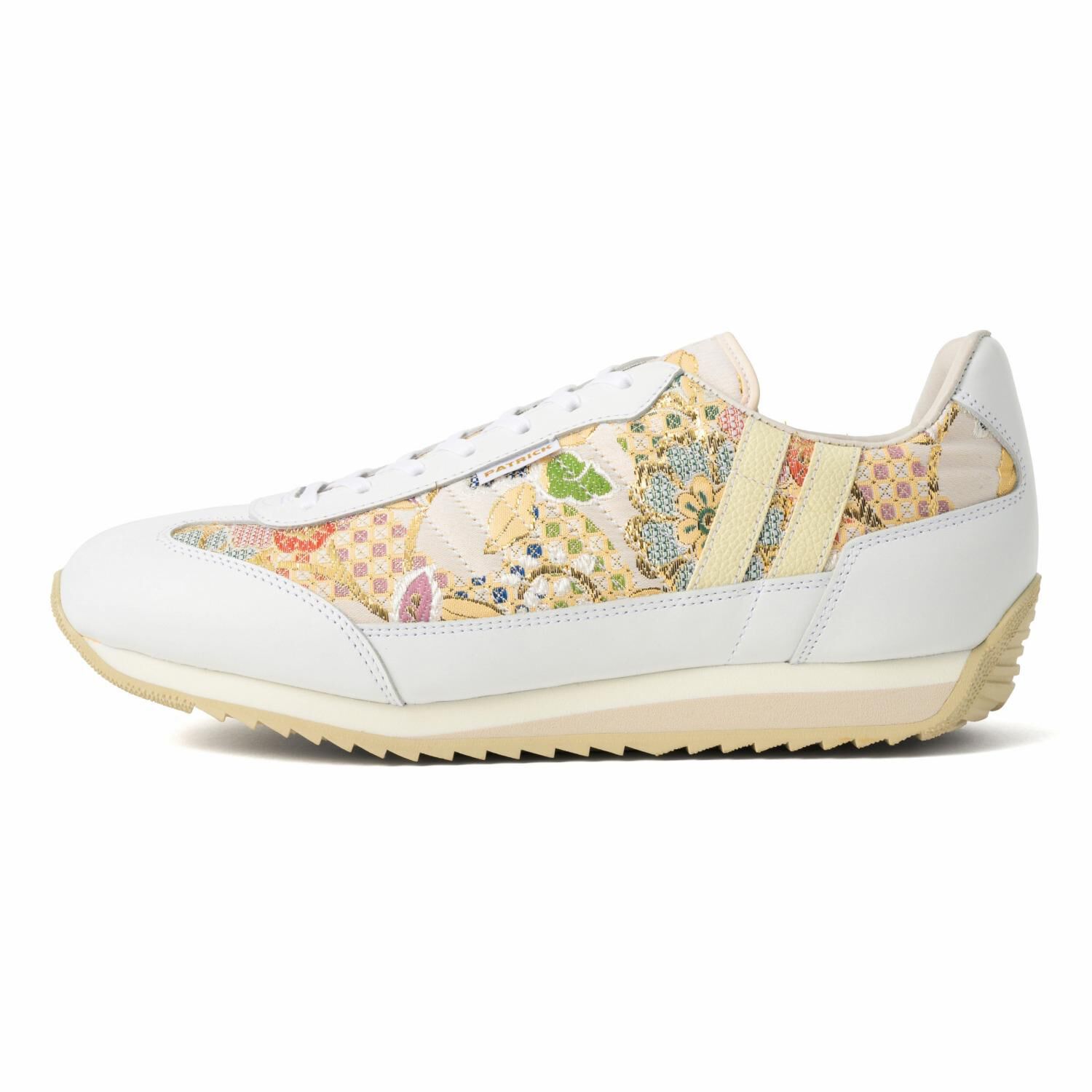 日本の伝統工芸の要素を取り入れたコレクション提案です。アッパーは創業100年以上の老舗による西陣織金襴を使用しています。大き目な花柄紋様に金糸が織り込.. |