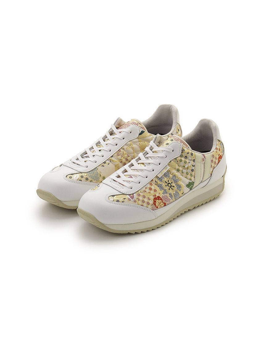 本物の西陣織りをアッパーとベロ部に用いた、優美な印象の「MARATHON-ORI 」。金糸が織り込まれた大柄の花紋様は左右で入り方が異なり、唯一無二の存在感を放.. |