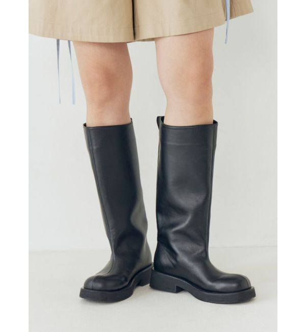 ■デザイン フェイクスウェードを使用したロングブーツ。今季らしくぷっくりとしたトゥデザインで重厚感のある印象に。サイドにはフェイクレザーでパイピング仕.. |
