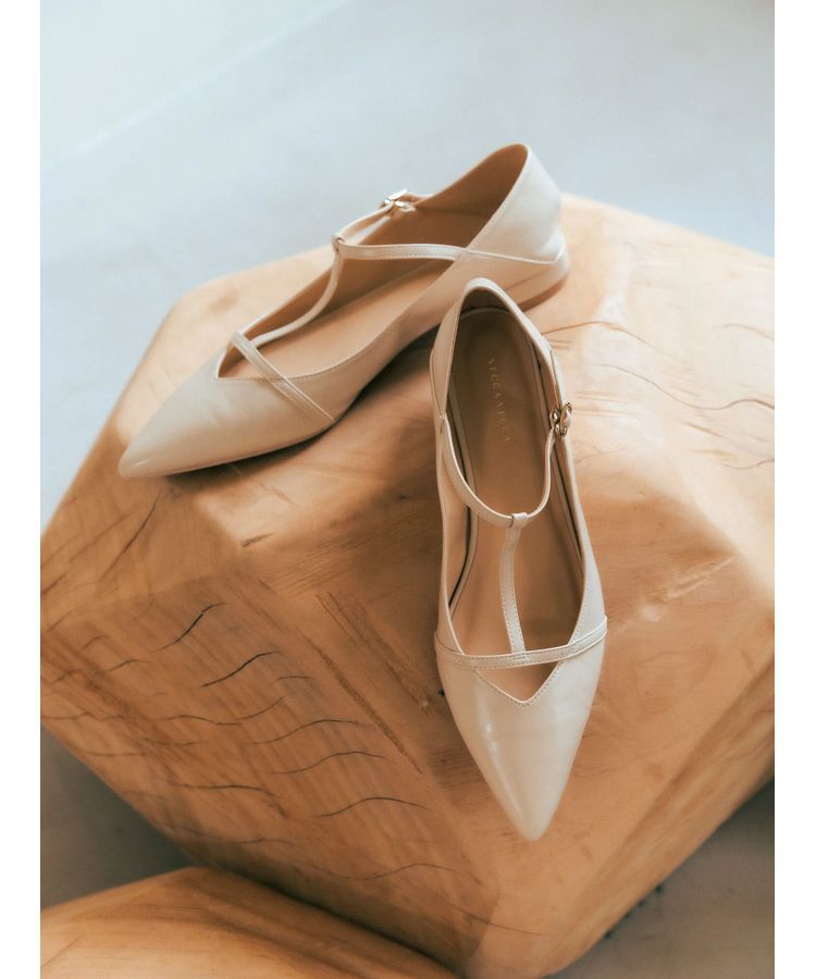 上品なツヤ感のあるフェイクレザーで仕立てたメリージェーンパンプス。ポインテッドトゥと華奢なTストラップが足元をエレガントに演出。踵を踏んでバブーシュ.. |