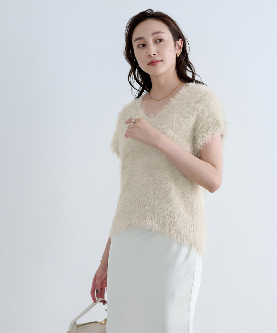 表情あるシャギーが可愛いニットベスト ◆DETAIL 毛足のあるシャギーが着映えします。 Vネックで顔回りすっきりします。 肩先まである袖が気になる二の腕をカバーしてくれます。 ◆FABRIC 柔らかく毛足のあるシャギー糸を使用し、ふわふわとした肌ざわりとあたたかみのある風合いが特徴です。 ティティベイト/titivate ur's|トップス|ニット・セーター