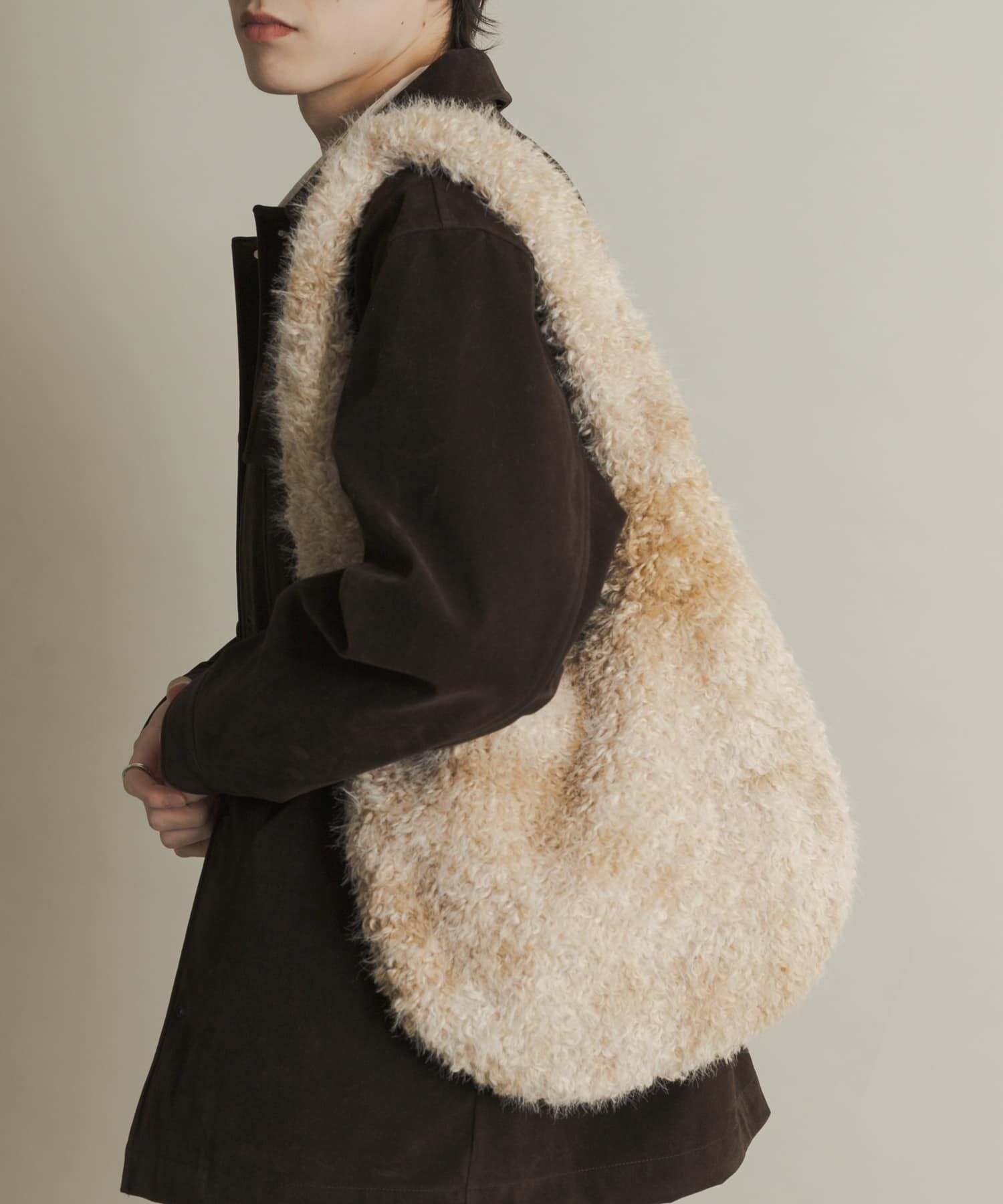 【素材感が主役。秋冬の装いを格上げするふわもこショルダーバッグ】・ムラ感のあるマーブルファーが、コーディネートに遊び心とトレンド感を加える主役級のア.. |