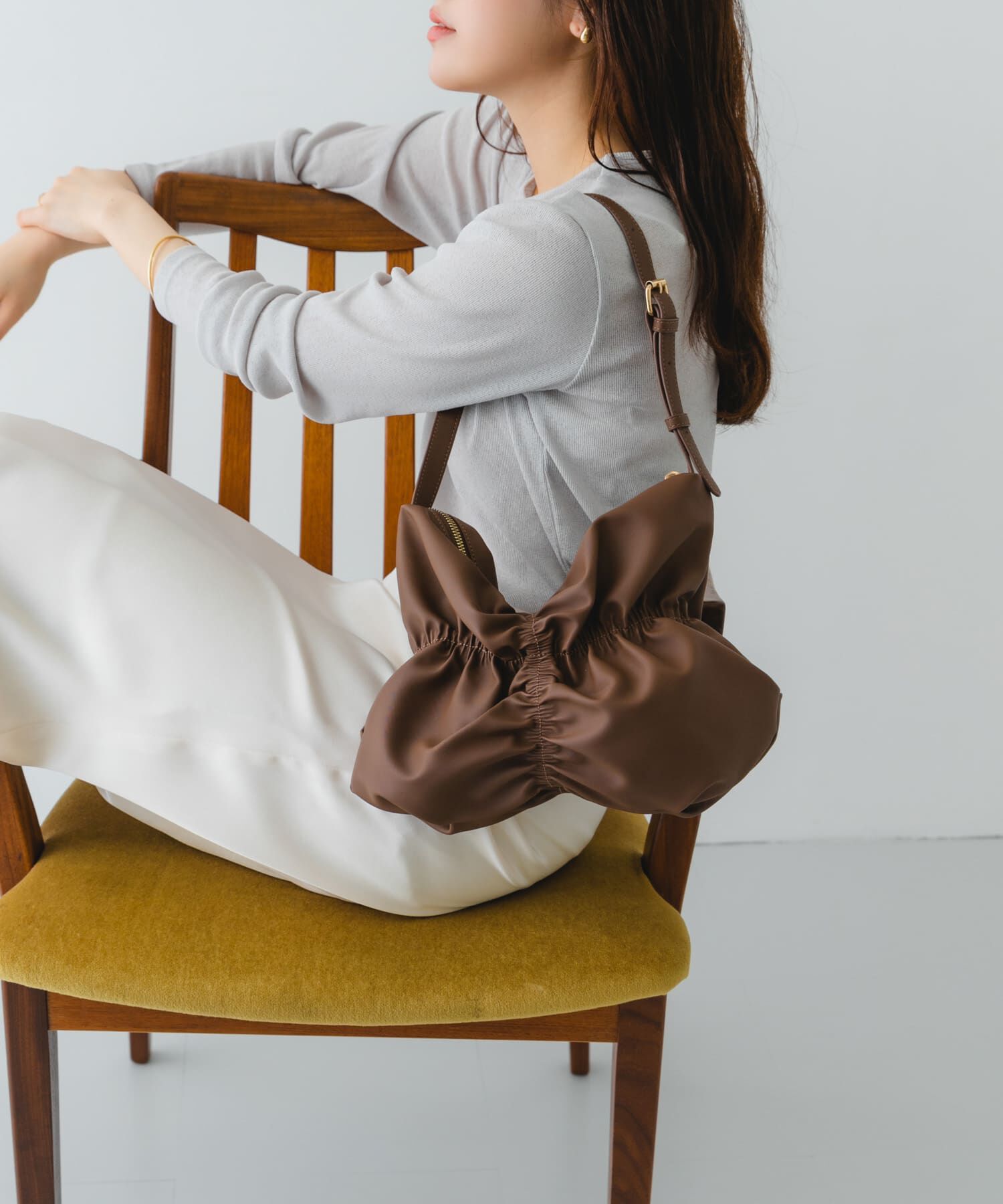 トレンド感溢れるデザインバッグ【Material】マットな質感がお洋服に馴染みやすい合皮【Design】バッグ前面にあしらわれたギャザーデザインが特徴的なショルダ.. |