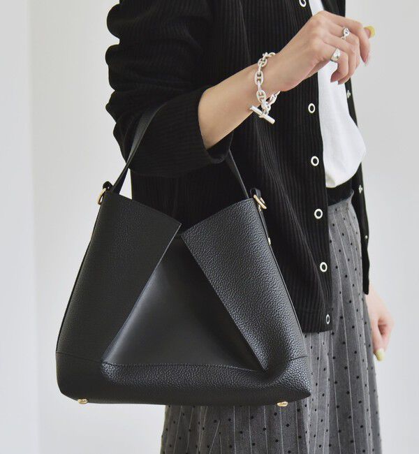 2025AWquaranciel●デザイントライアングルの変形型が目を惹く、異素材コンビデザインがポイントのハンドバッグ。サイドと底部分はシボ感があり、素材のコント.. |