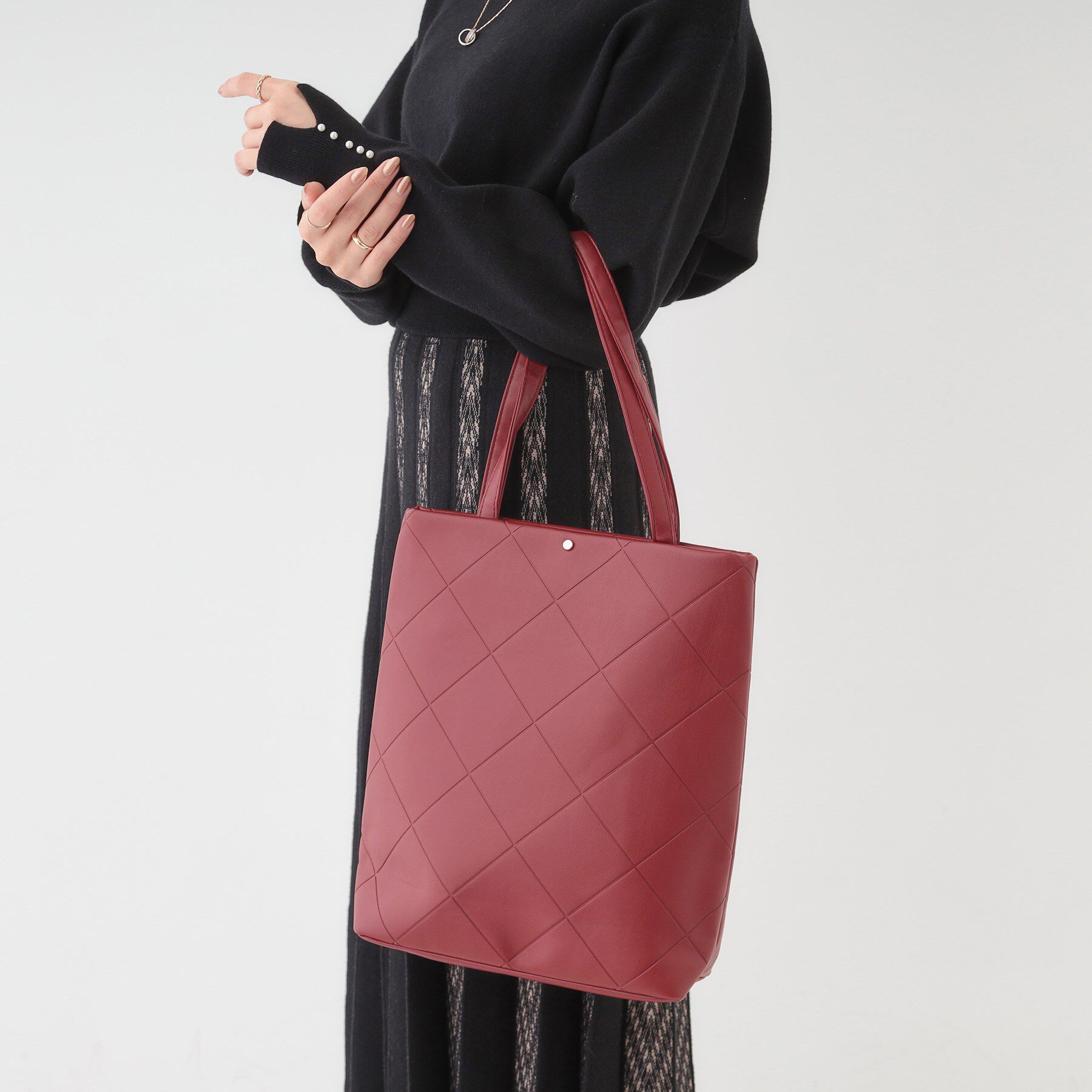 【デザイン】シンプルなデザインながらもバイアスチェックを型押ししてさりげなくポイントにしました。ボックス型で少しクラシカルな雰囲気なのできれい目スタ.. |