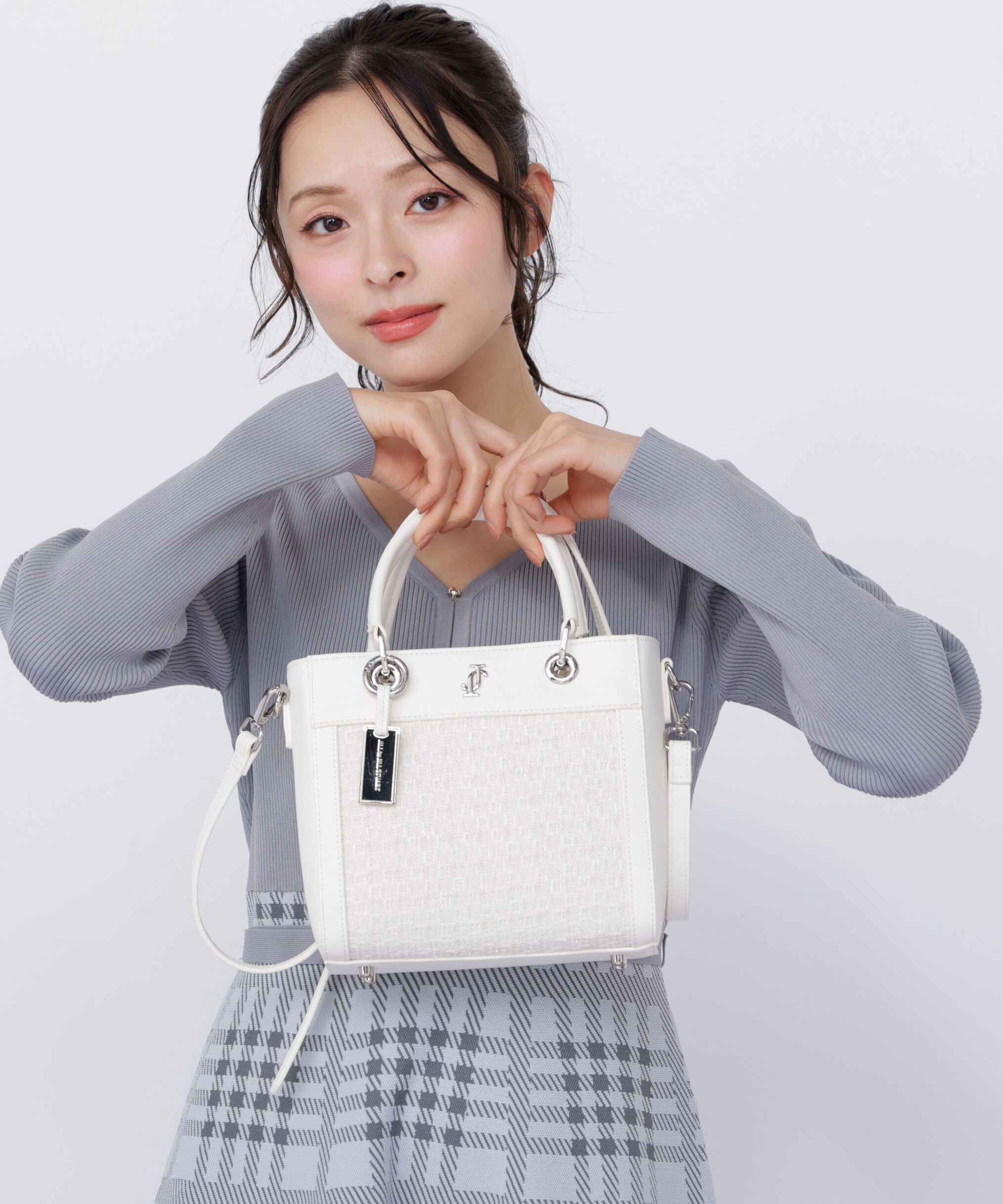 ツイード素材とスムース素材を組み合わせた軽やかなトートバッグ。異素材のコントラストに、丸ハンドルやメタルパーツがエレガントアクセントになっています。.. |