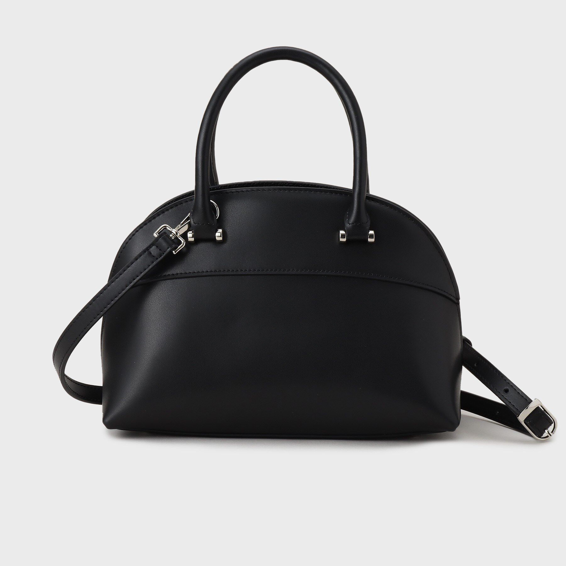 【デザイン】モダンなデザインでスタイリングを格上げする、ワンハンドルのショルダーバッグ。ツヤのある合成皮革を使用し、エレガントな印象を与えます。前後.. |