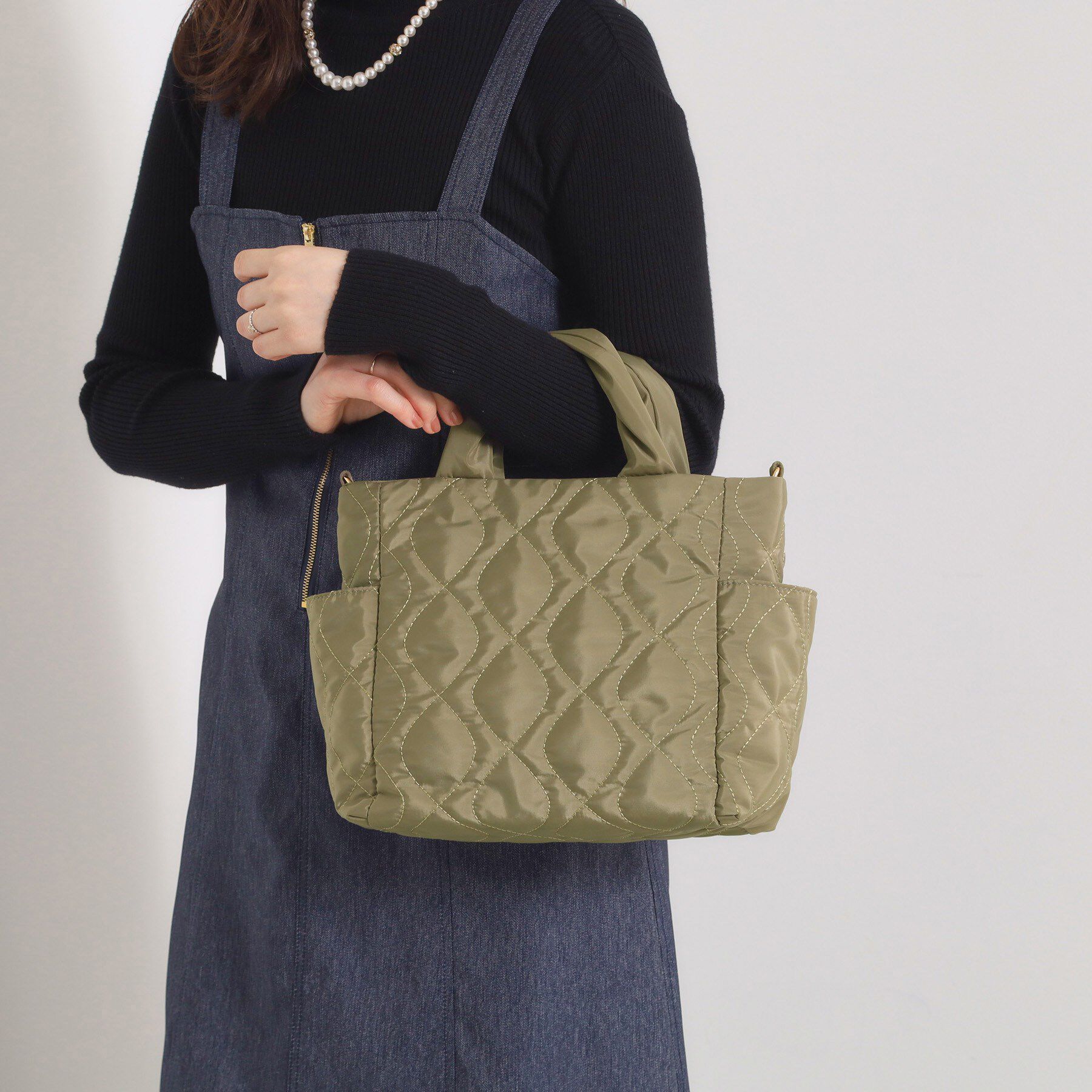 【デザイン】デザインキルトが特徴のミニトート。ふっくらとしたクッションハンドルが柔らかい印象にしてくれます。微光沢のあるポリエステルを使用しているの.. |