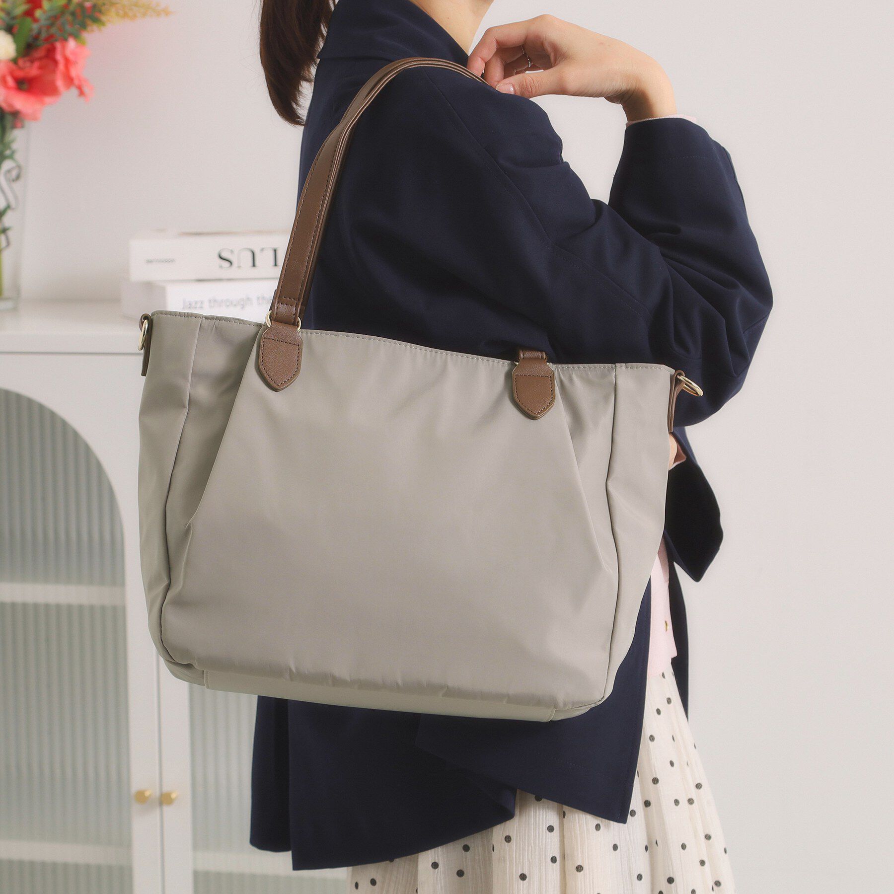 【デザイン】張りのある軽量ツイルポリエステルを使用した2WAYトート。間口が広い舟形シルエットなのでコンパクトな見た目ながらもたっぷり収納◎両あおりポケ.. |