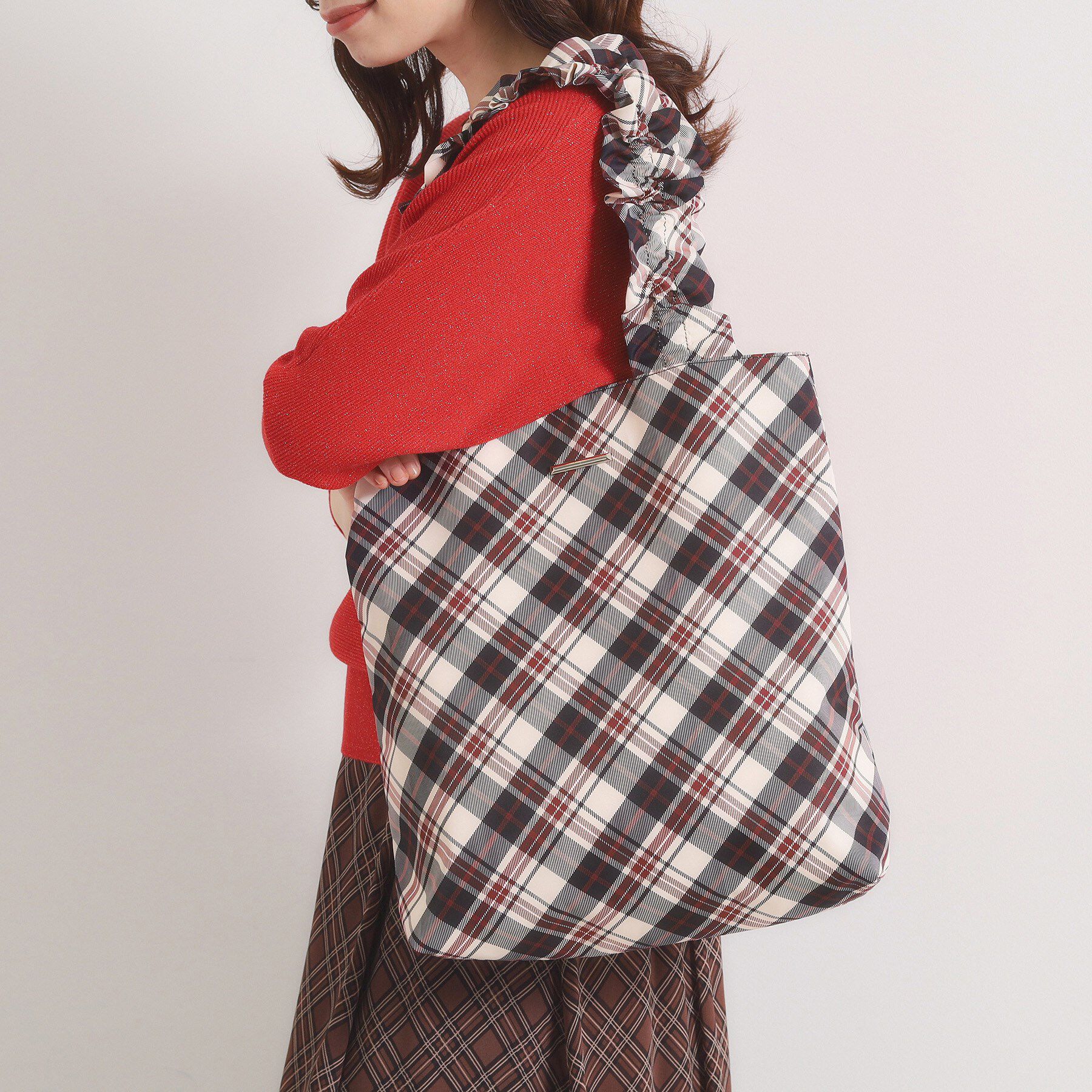 【デザイン】トレンド感たっぷりのドロストビッグバッグ。表情豊かなドット&チェック柄を展開し、フロントにさりげないロゴパッチをあしらったモダンな仕上が.. |