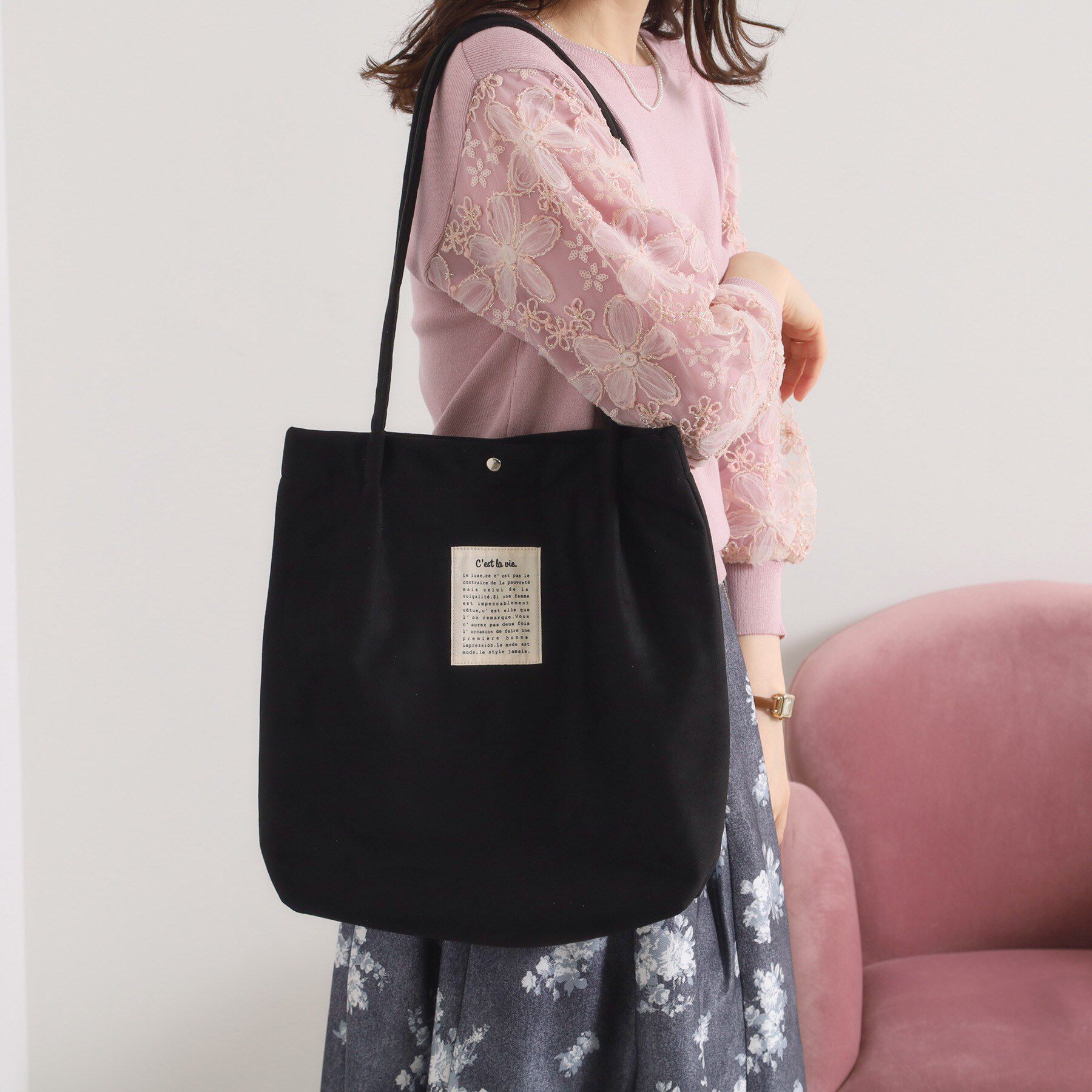 【デザイン】フロント部分の刺繍がガーリーで可愛らしいA4トート。芯材を入れて張りのある本体は中身が少なくてもしっかり自立してくれます。底部分は汚れがサ.. |