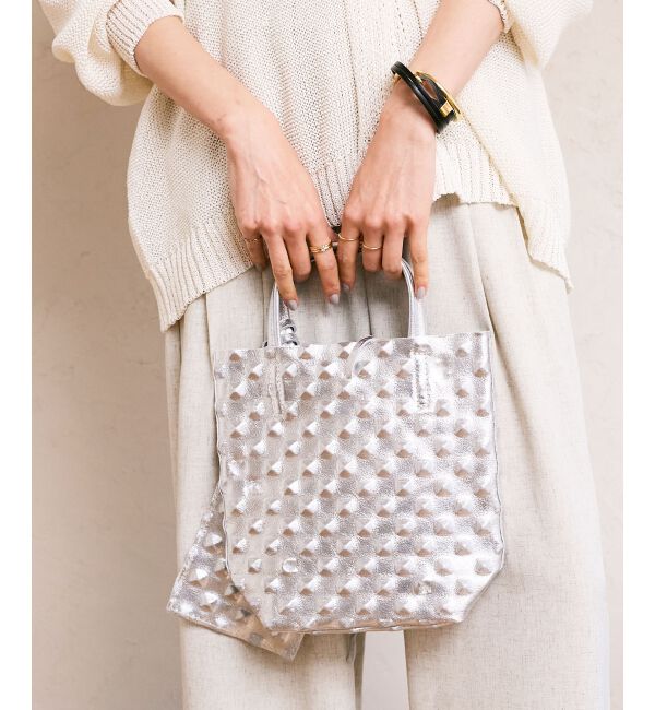 表面のポコポコとしたエンボス加工が目を引く、シルバーのミニトート。コンパクトながらマチ付きで収納力があり、付属のポーチで小物の整理も◎立体感のあるテ.. |