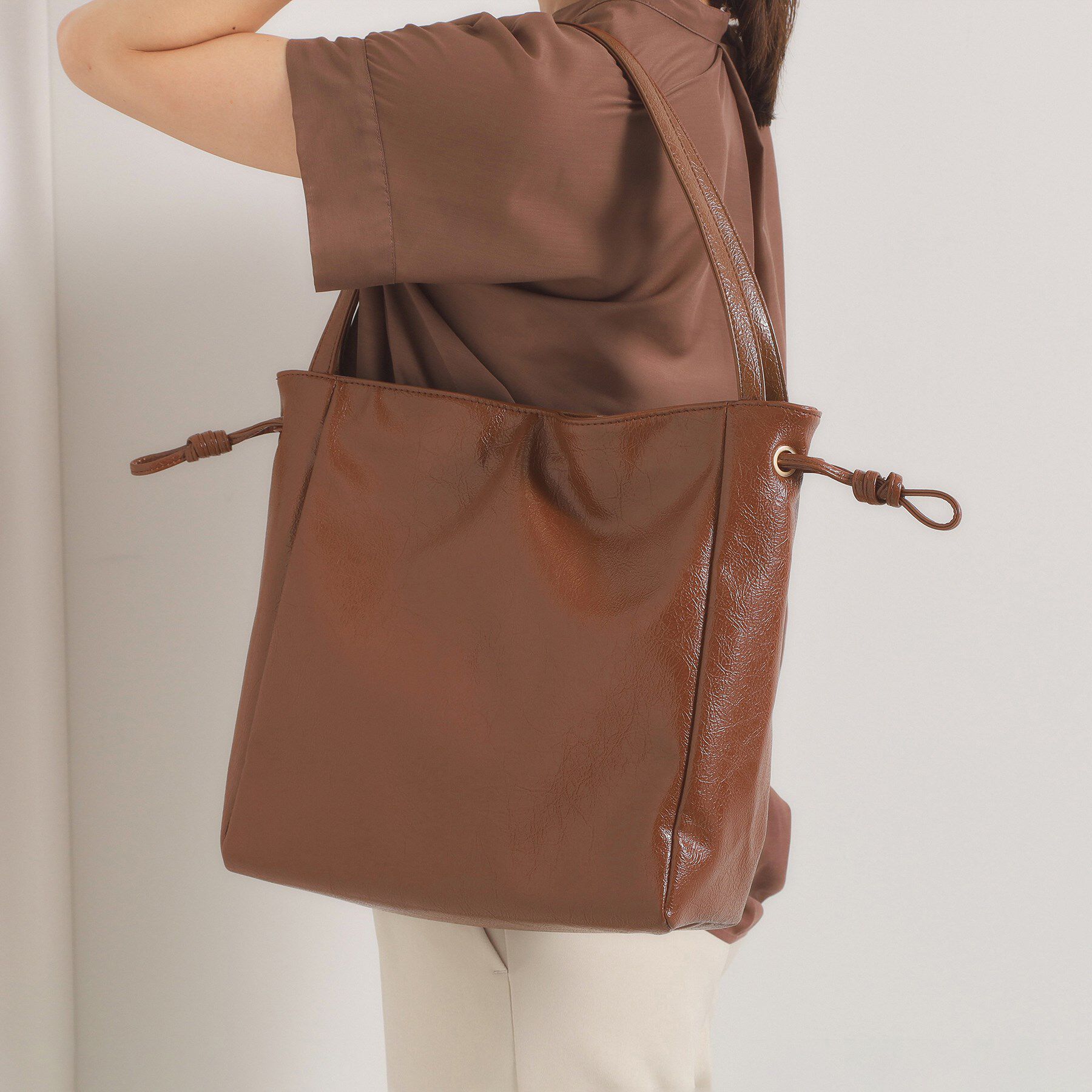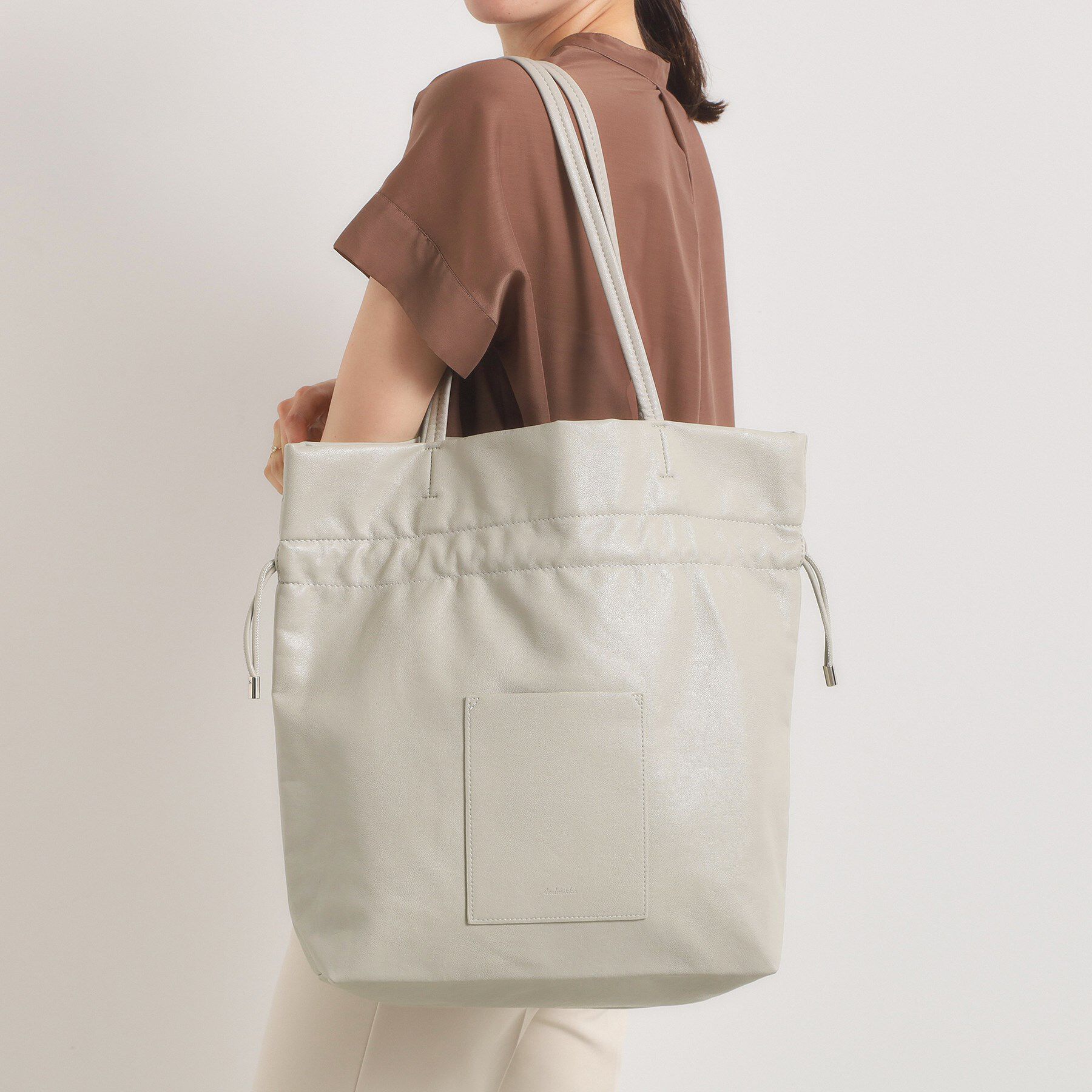 【デザイン】今季大注目のヴィンテージ合皮を使用した巾着トート。クラッシュ風の表面感×艶のあるガラス合皮で一気にトレンド顔に♪やや幅広の底マチで収納力も.. |