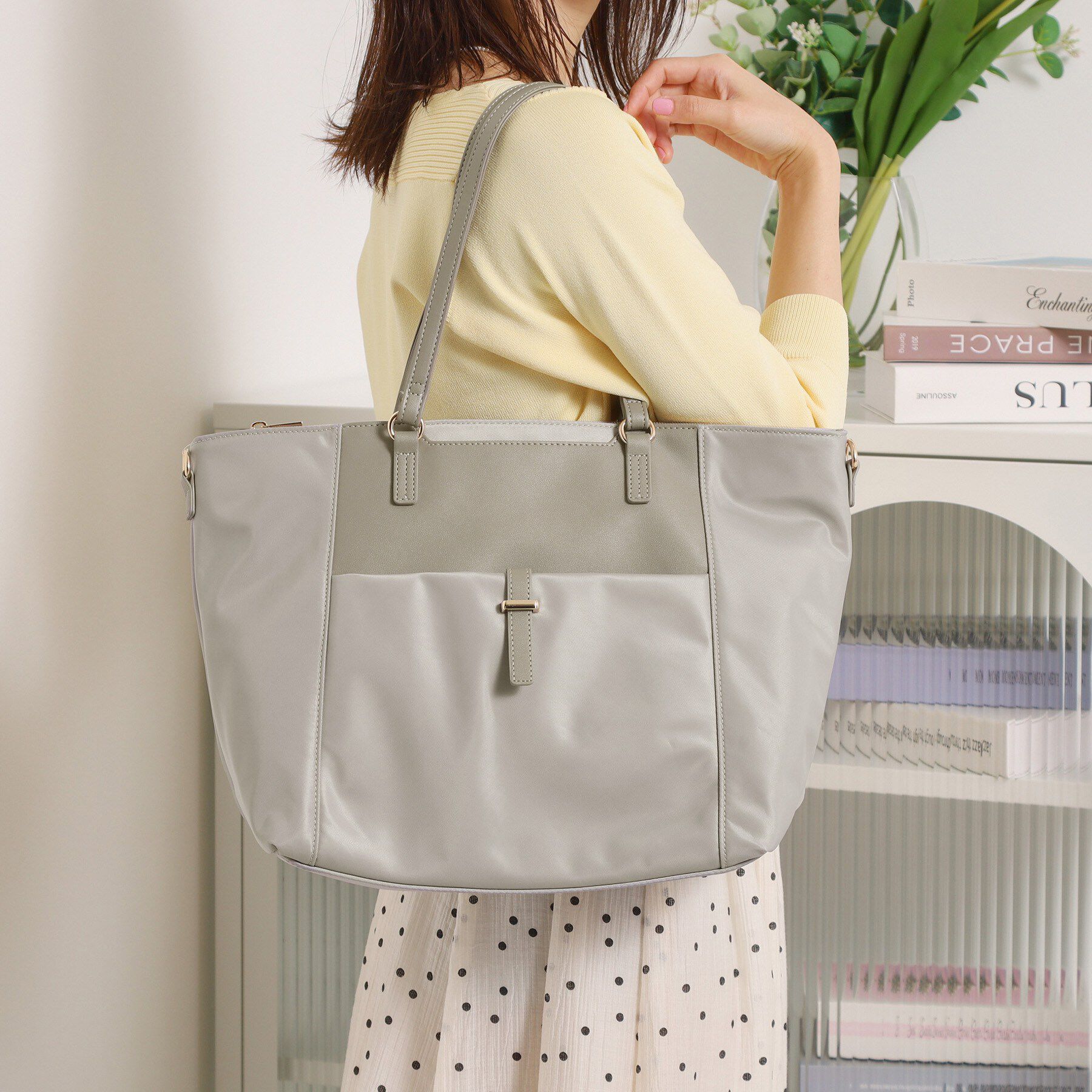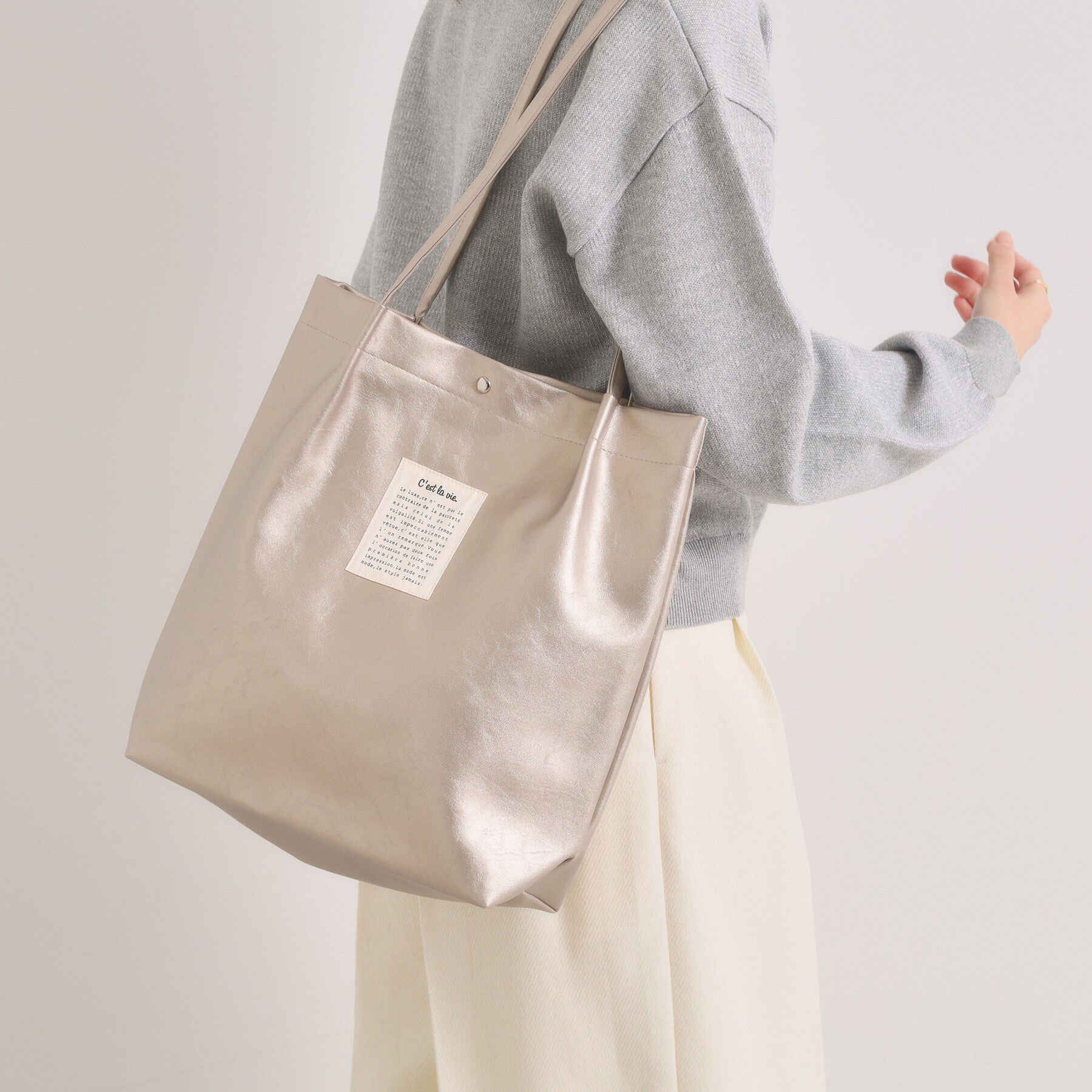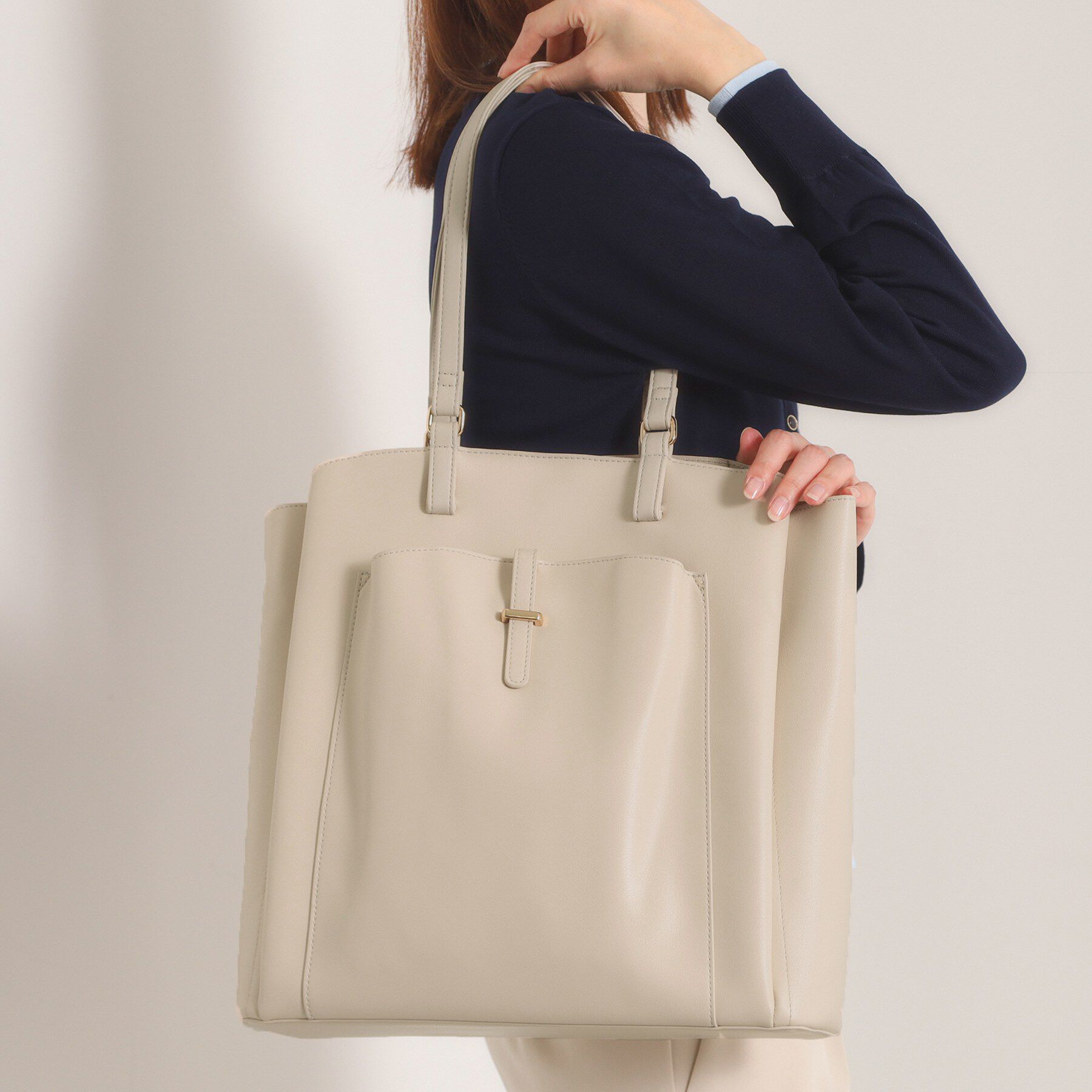 【デザイン】軽やかで上品な「楽もちバッグシリーズ」のA4トート。シボ感のある合皮で上品な表情に仕上げたミニマルなフォルムが魅力。ゴールド金具がさりげな.. |