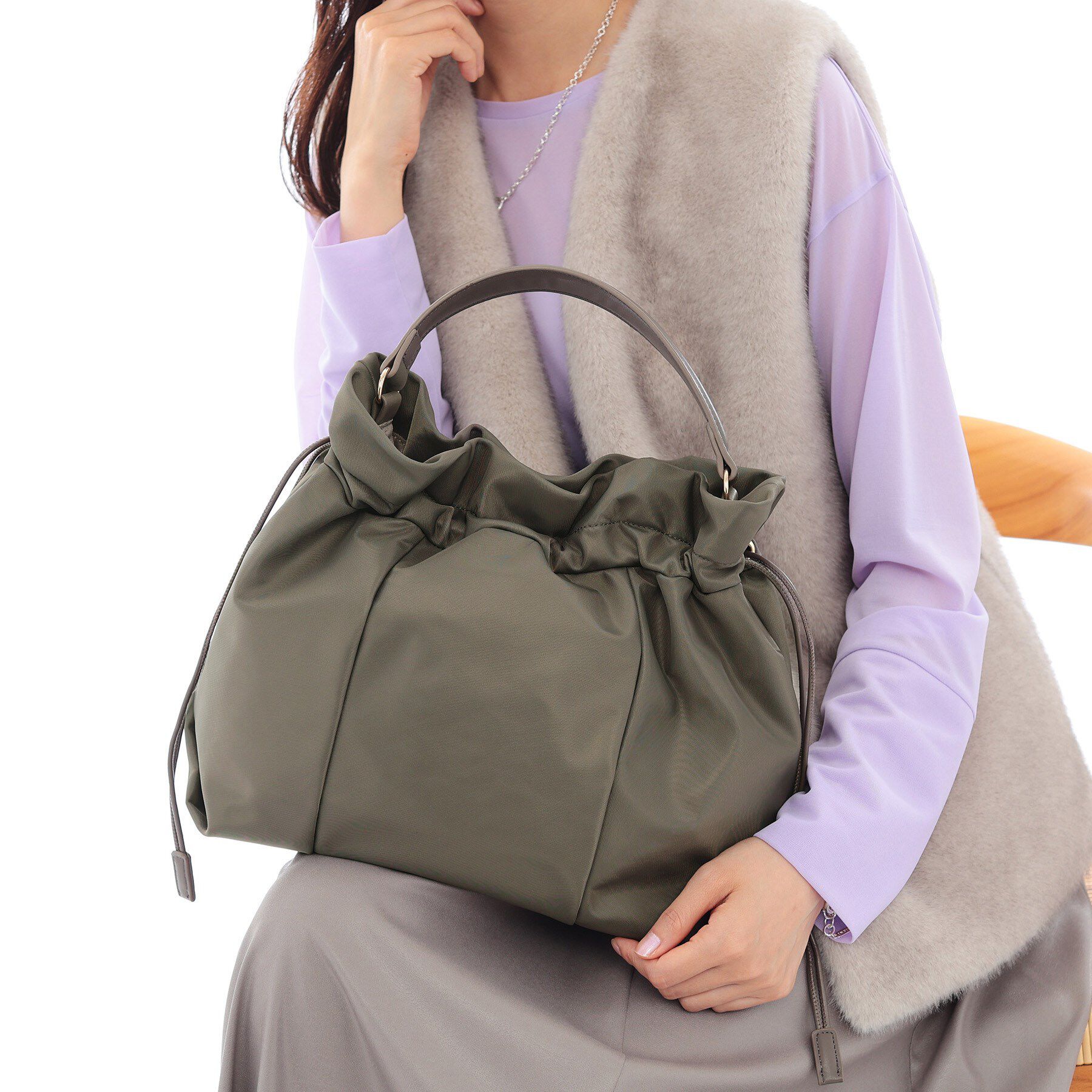 【デザインポイント】光沢で上品さも兼ね備えた軽量バッグです。巾着のようにドロストでシルエットに変化をつけられます。合皮とのコンビで良質感ある見え感に.. |