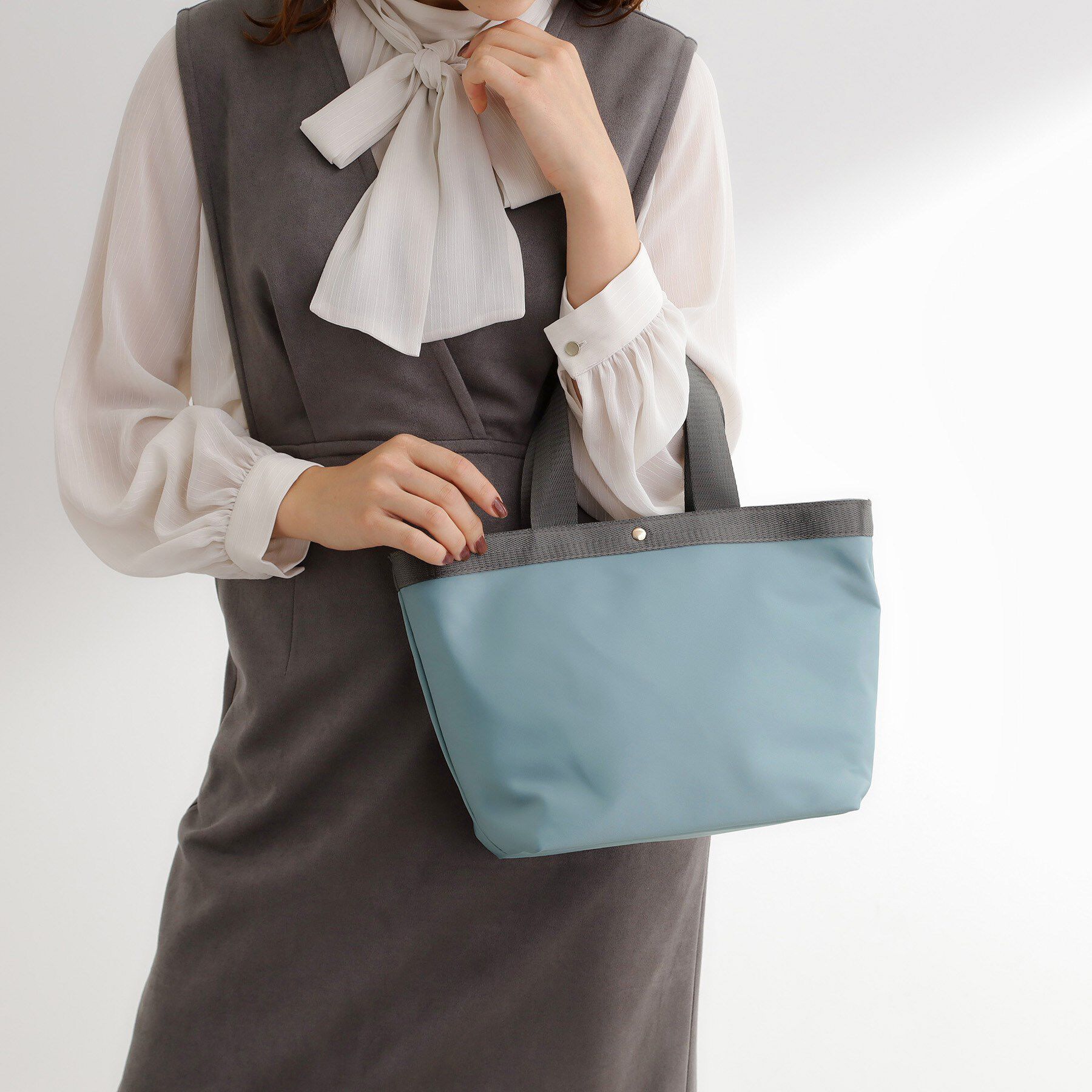 【デザイン】ハンドル根元のリボン風デザインがフェミニンで上品なコンパクトサイズのトートバッグです。本体真ん中はファスナー付き収納、前後は入れやすい収.. |
