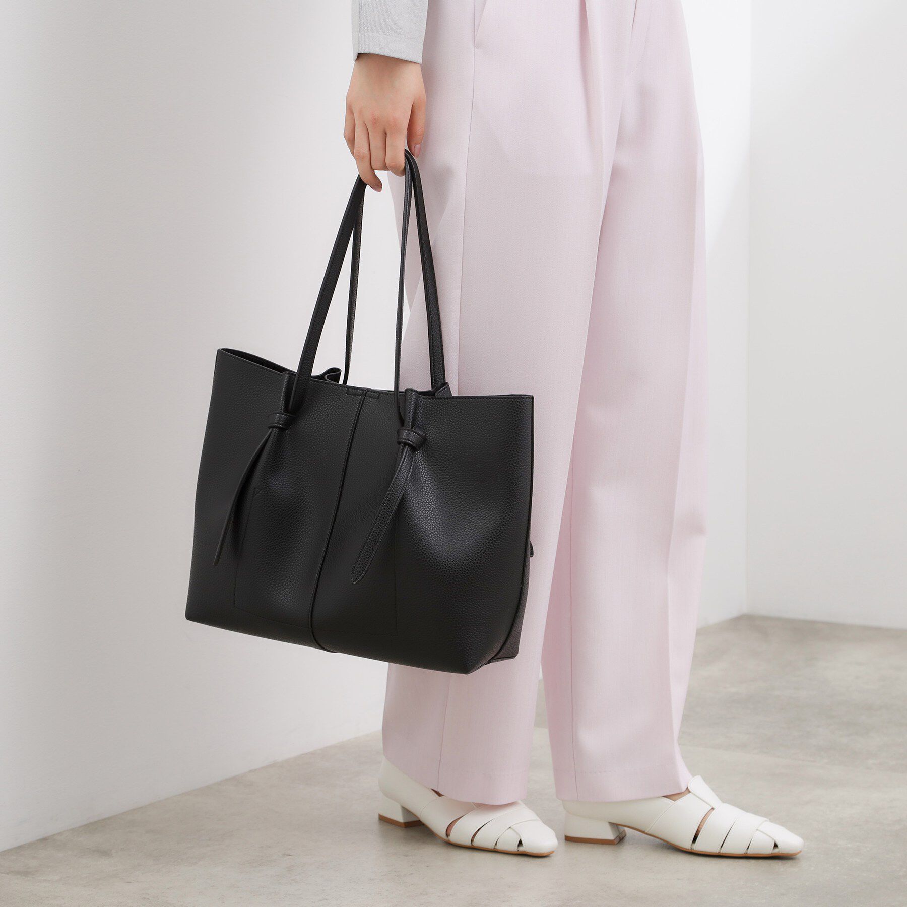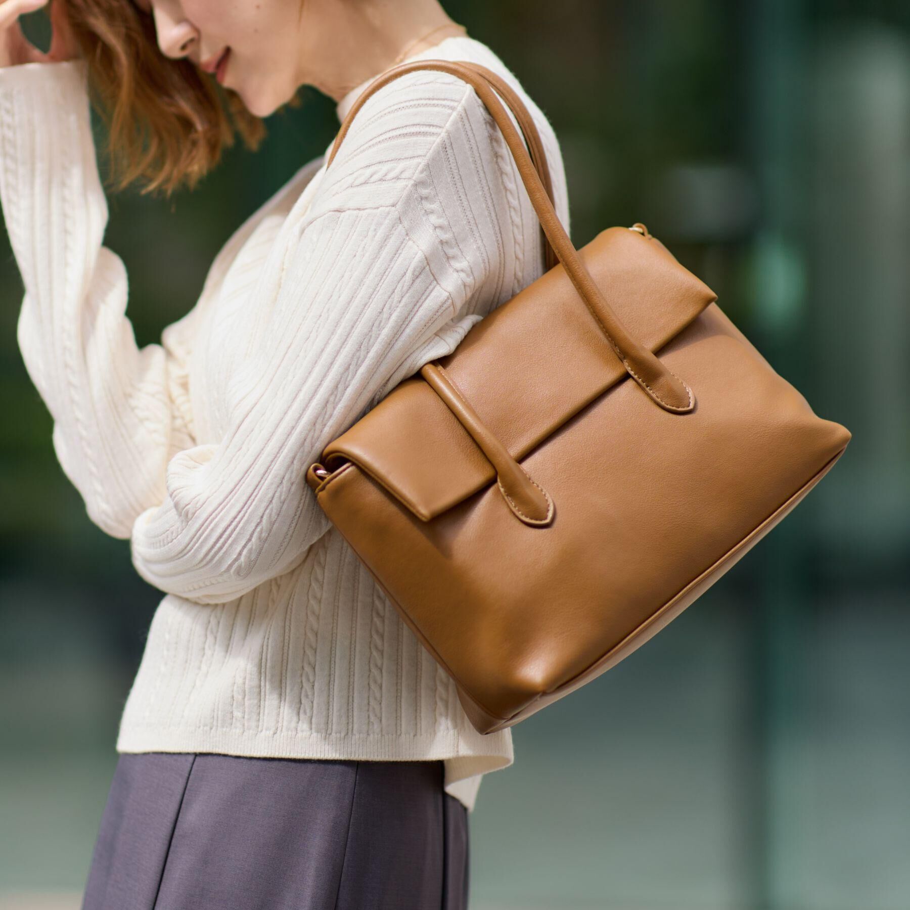 【デザイン】A4サイズが収納でき、大容量でありながら洗練されたシンプルデザインが魅力のトートバッグ。ソフトなシボ感が施された合皮素材が、上品さとカジュ.. |
