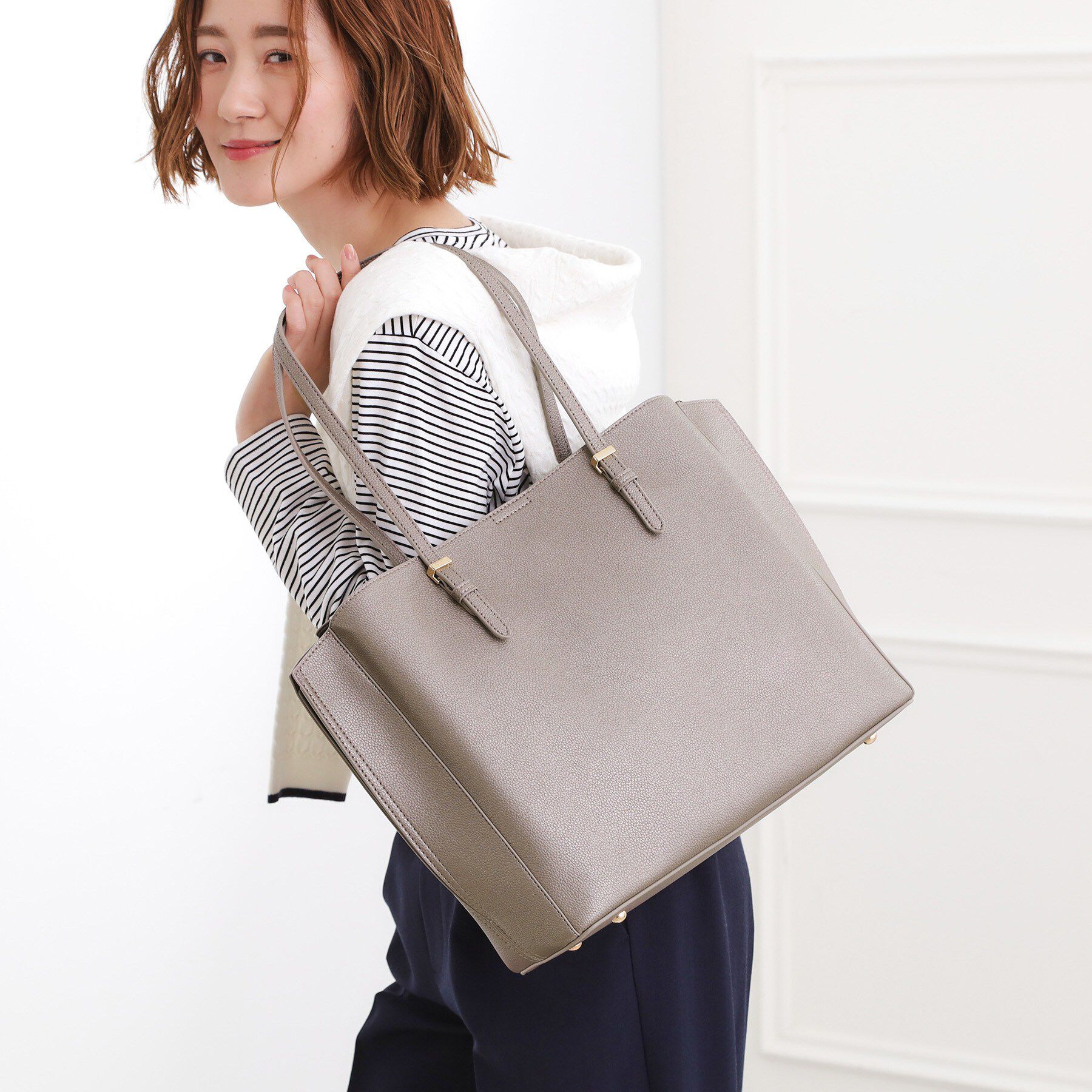 【デザイン】シンプルながらもフラップデザインが存在感のあるトートバッグ。シボ感のある合皮素材を使用。長めデザインのハンドルは肩掛けしやすく、付属のシ.. |