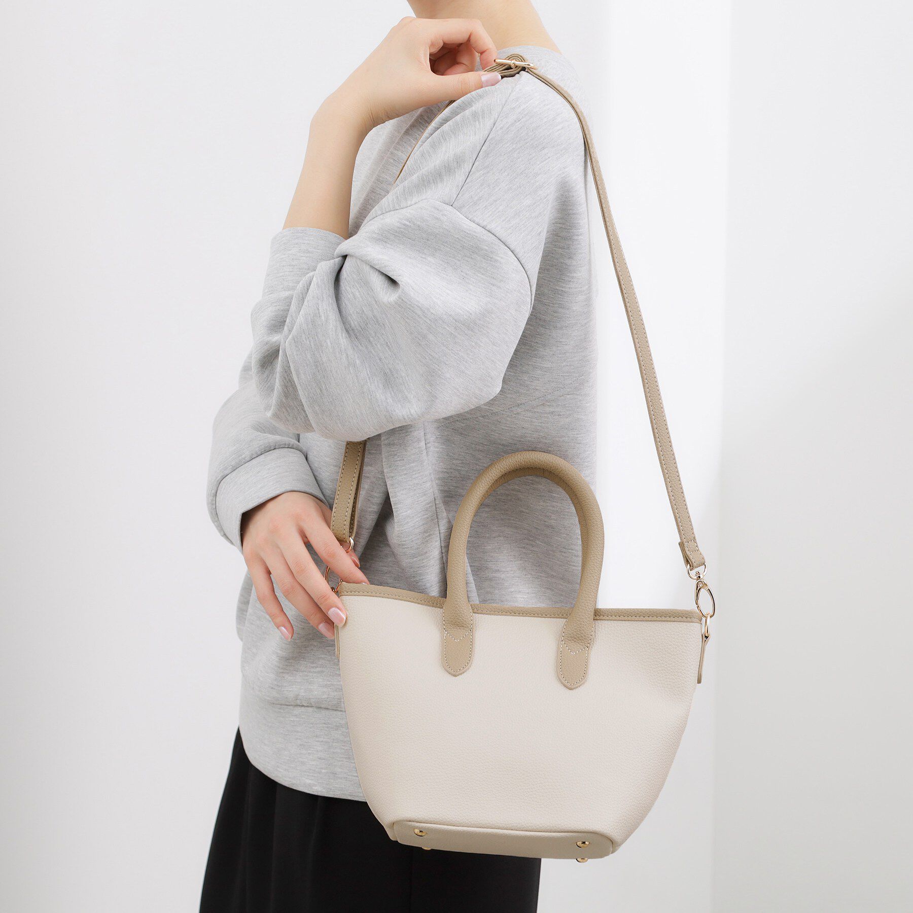【デザイン】細かなシボ感のある合皮素材のハンドル部分と、ボディ部分の配色カラーがアクセントになる2WAYトートバッグ。付属のショルダーストラップを使えば.. |