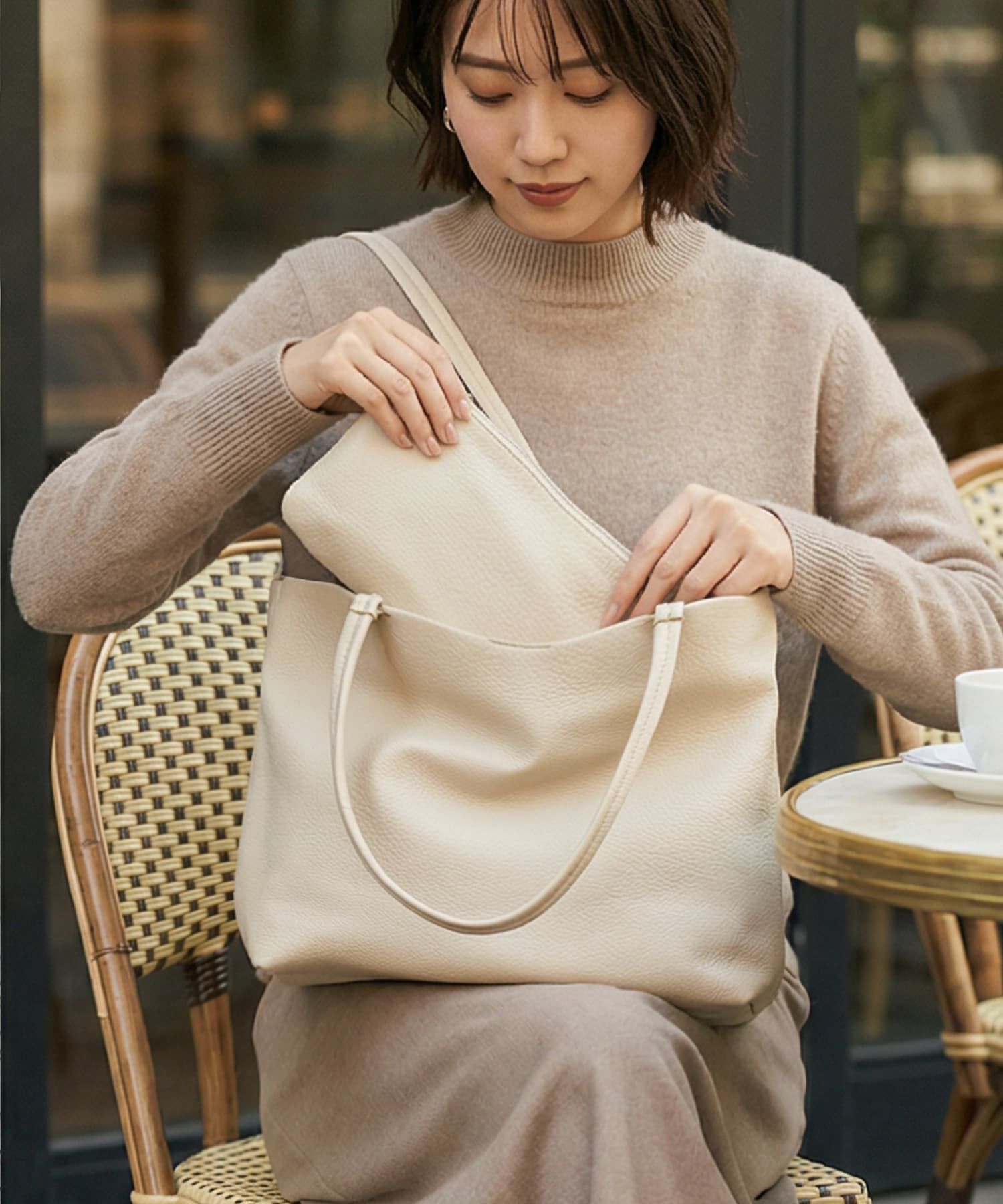 形と質感でオシャレな雰囲気を楽しむ、横長フォルム×浅型の大きめトートバッグ◆シンプルでクール、横幅にしっかりと長さがある今っぽい雰囲気のトートバッグで.. |