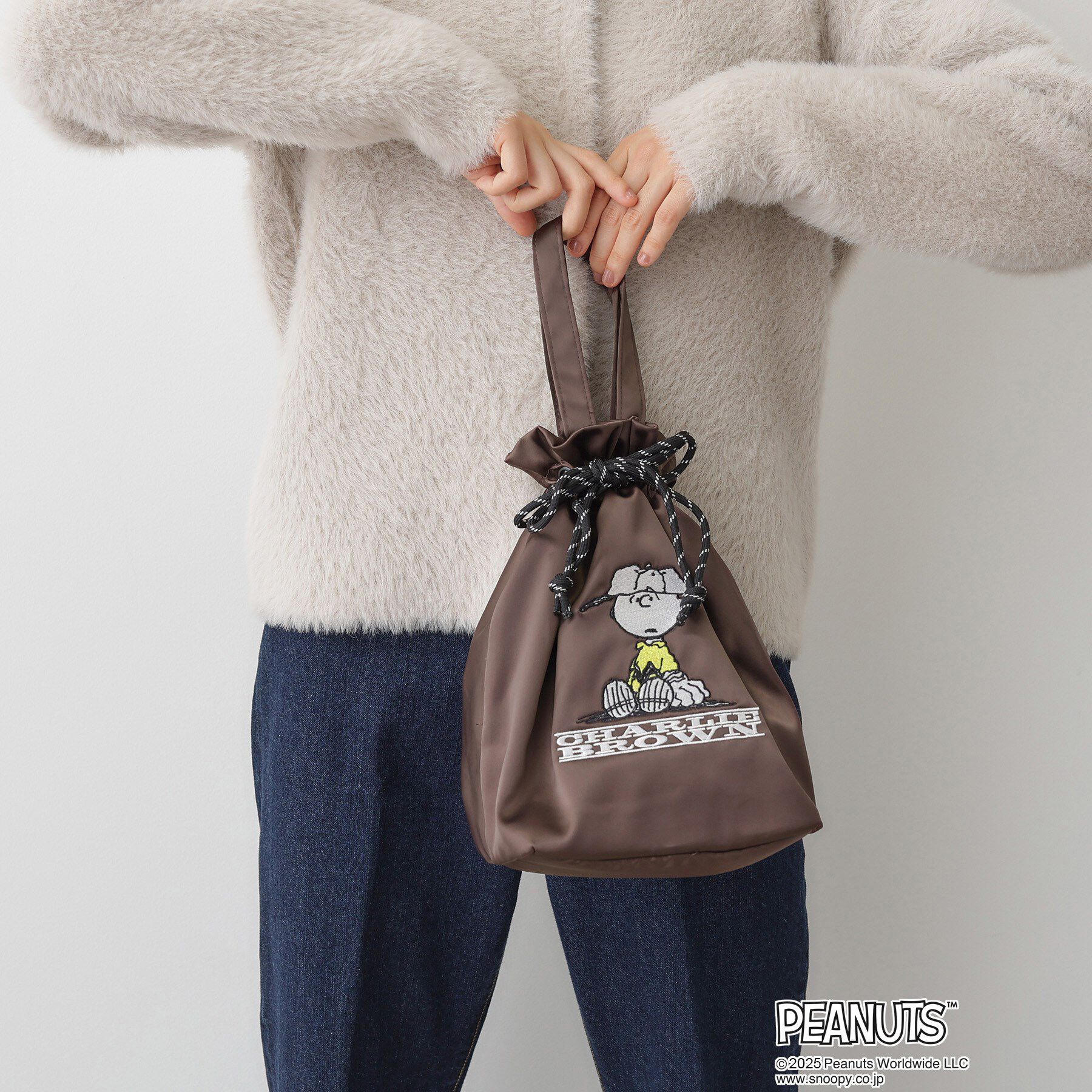 【デザインポイント】PEANUTSコラボのバッグ。光沢のあるサテン生地にベースボール×チャーリーブラウンのイラストを刺繍。キュッと絞る巾着にもなるトートバッ.. |