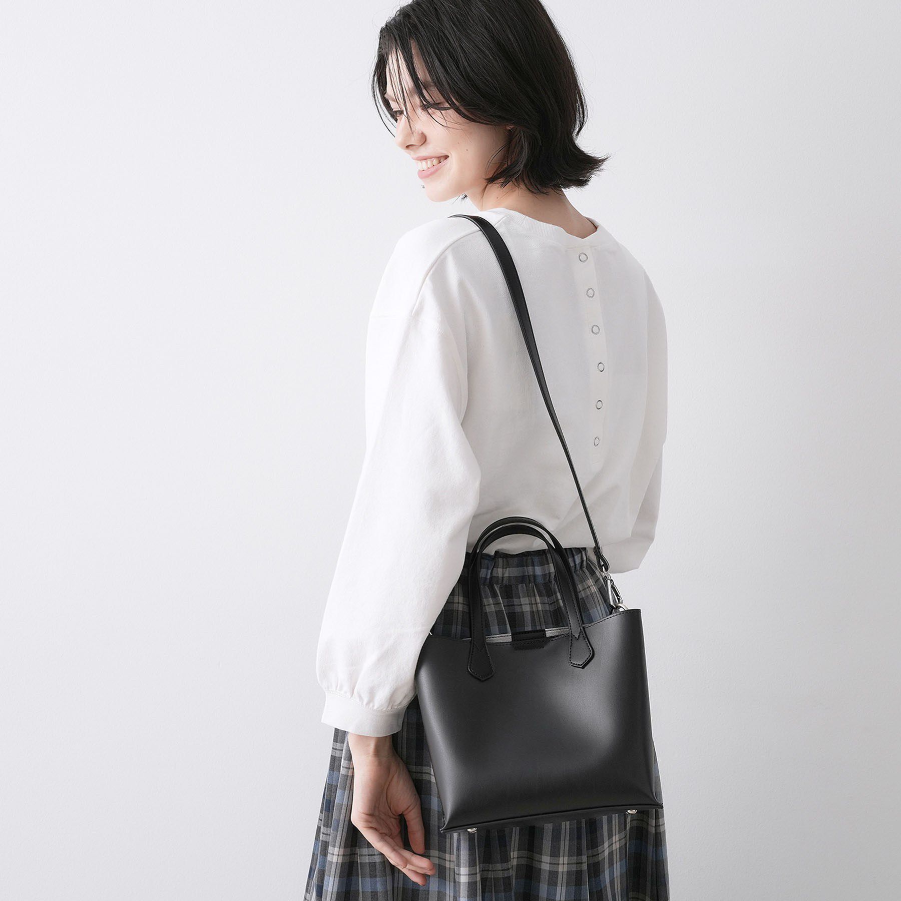 【デザインポイント】1枚革仕立ての合成皮革を使用した、すっきりと上品な印象のミニバッグ。無駄を省いたシンプルなフォルムで、きれいめからカジュアルまで.. |