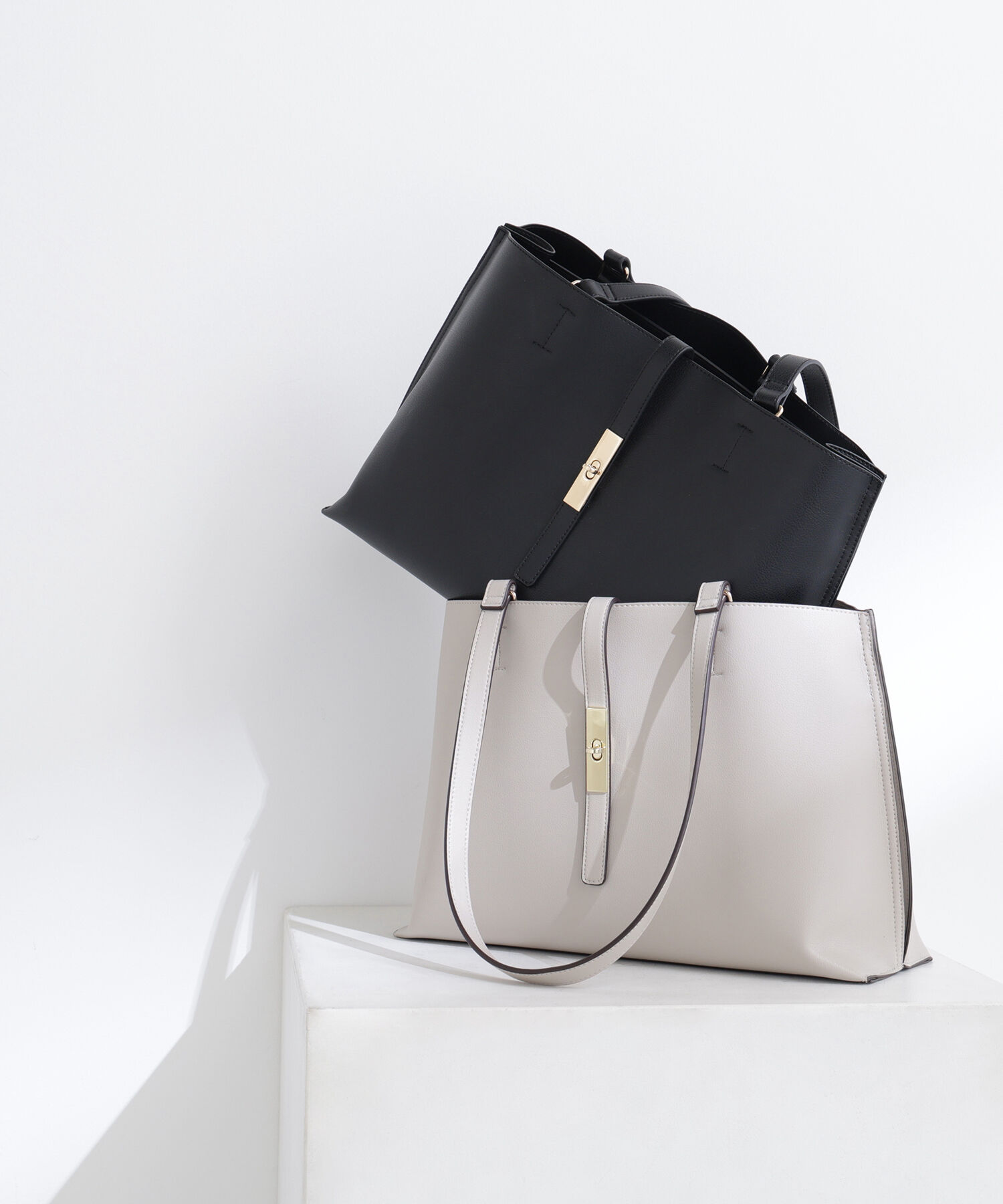軽量なダブルフェイスのフェイクレザーを使用した横長トートバッグ。甘さを抑えたさり気ないリボンディテールが、オフィスシーンにもぴったりなデザイン。中は.. |