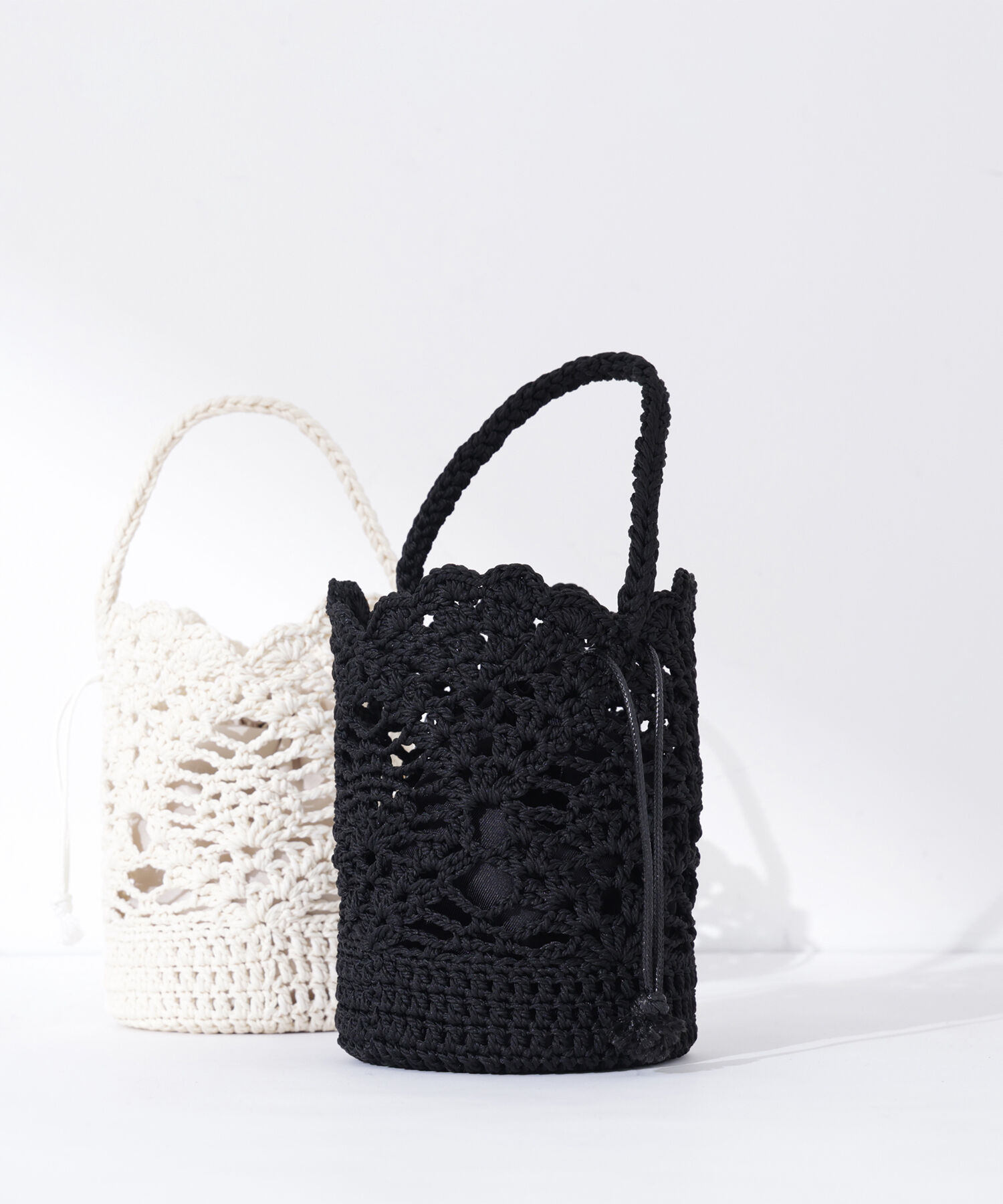 レースのような繊細な編み柄のバケツ型バッグ。今季トレンドのレースをさりげなく小物で取り入れると、いつものスタイルをアップデート出来ます。インナーに巾.. |
