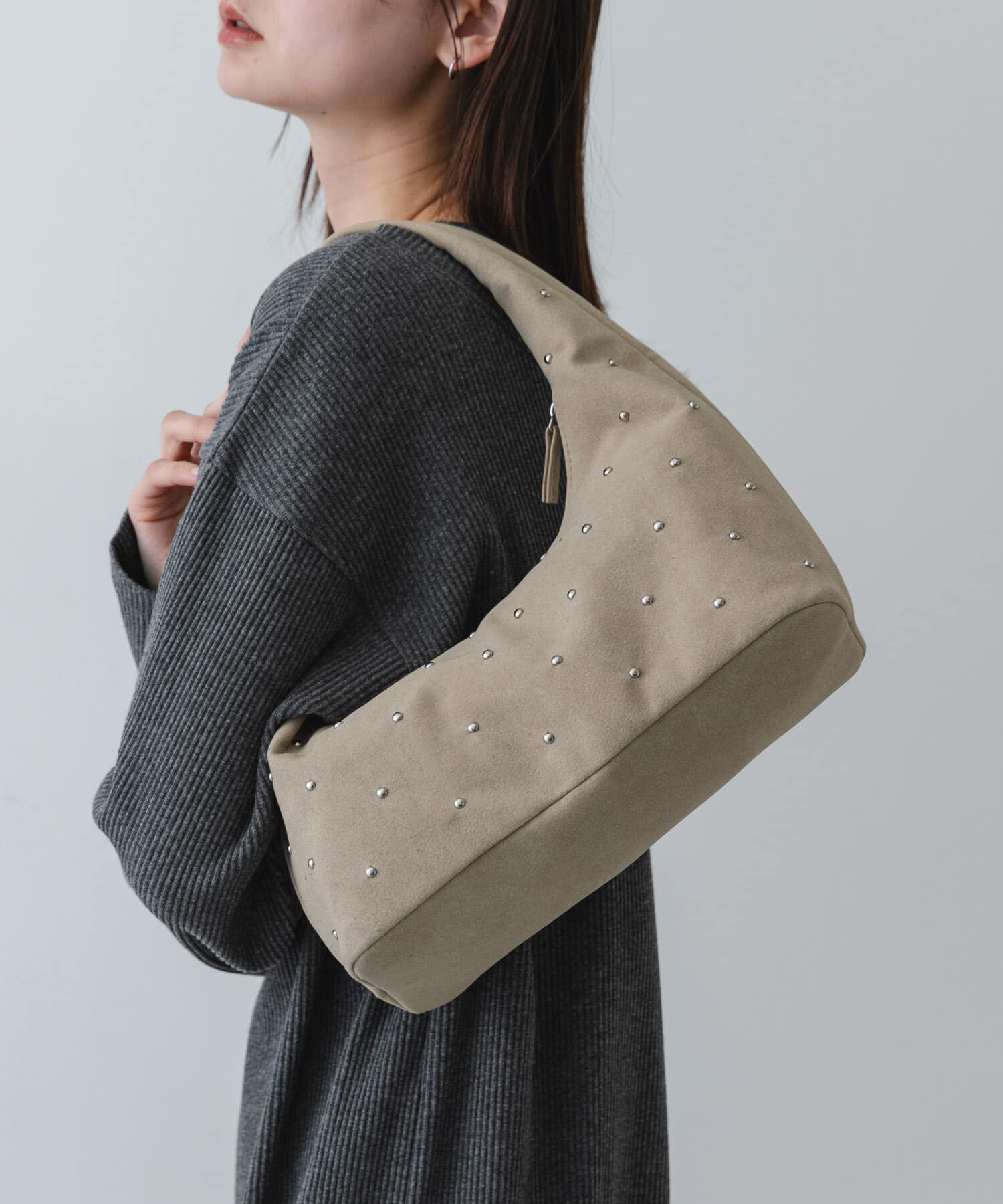 【遊び心をプラス。スタッズが煌めく立体フォルムバッグ】・しぼのあるフェイクレザーと、しっかりとしたフェイクスウェードの表情豊かなアソート展開・手元に.. |
