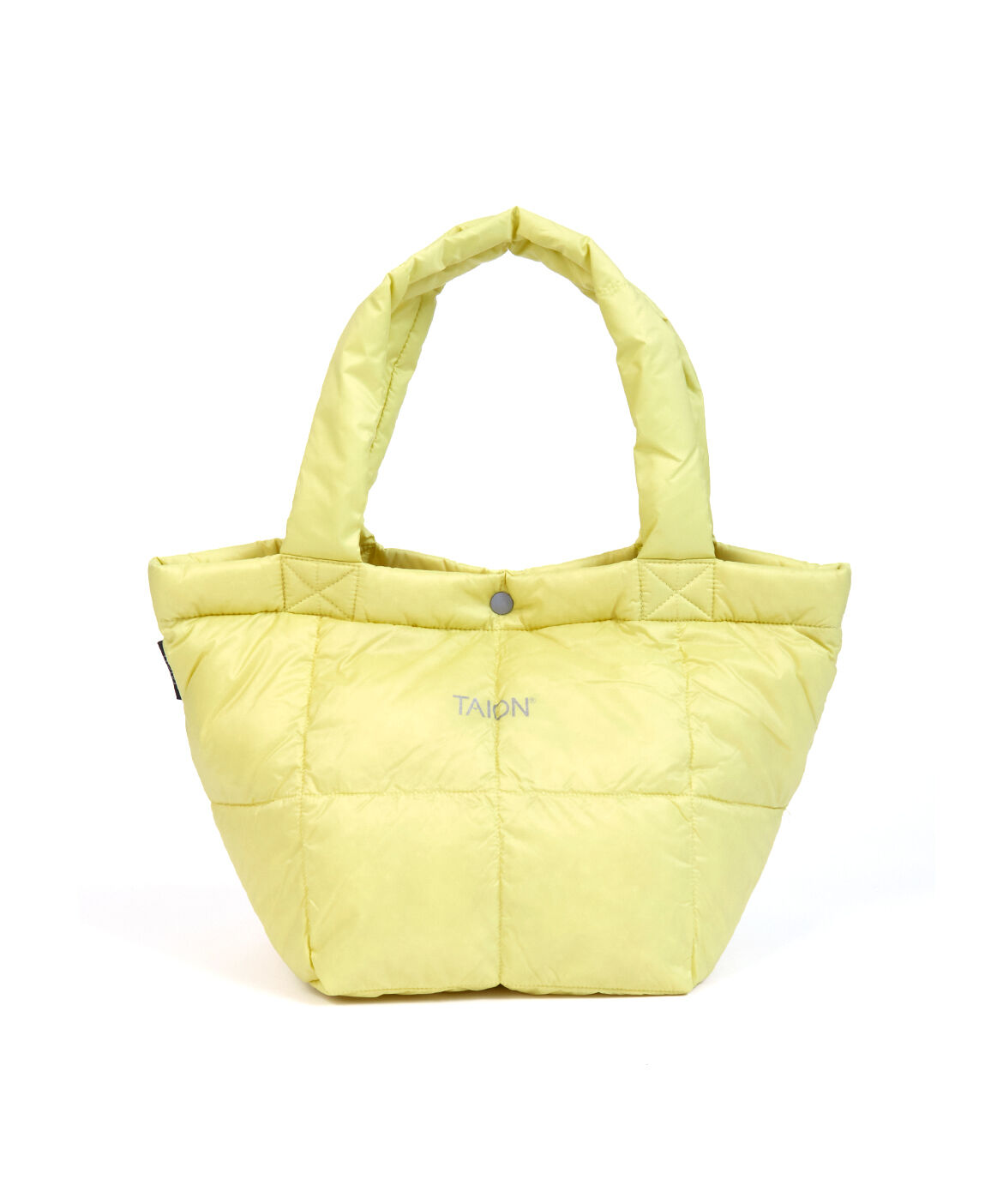 小ぶりなサイズ感が魅力な、ダウンランチトートバッグ。フロント上部の小さめのTAIONロゴプリントがアクセント。持手は手持ちで丁度いい長さとなっています。.. |