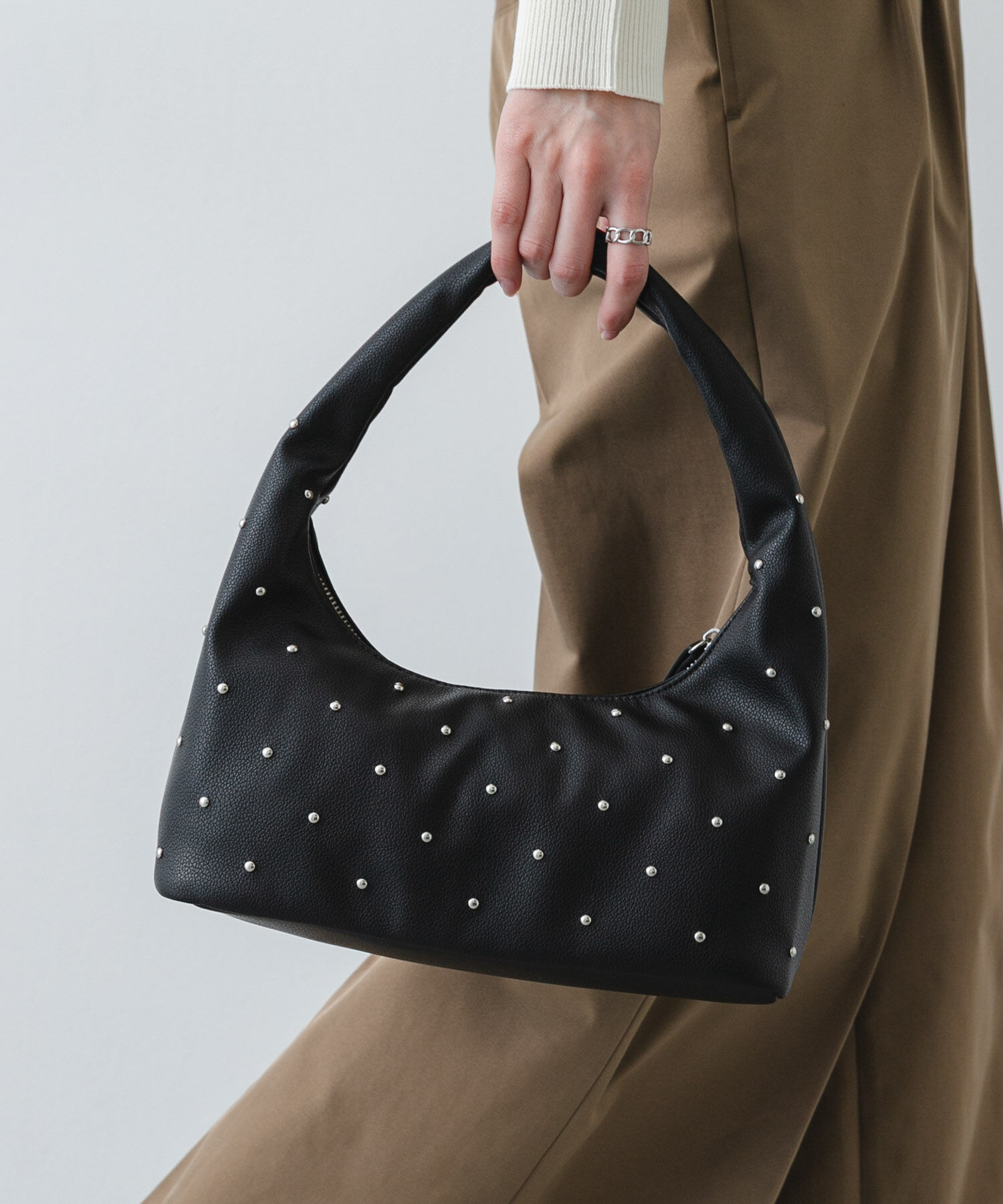 【遊び心をプラス。スタッズが煌めく立体フォルムバッグ】・しぼのあるフェイクレザーと、しっかりとしたフェイクスウェードの表情豊かなアソート展開・手元に.. |