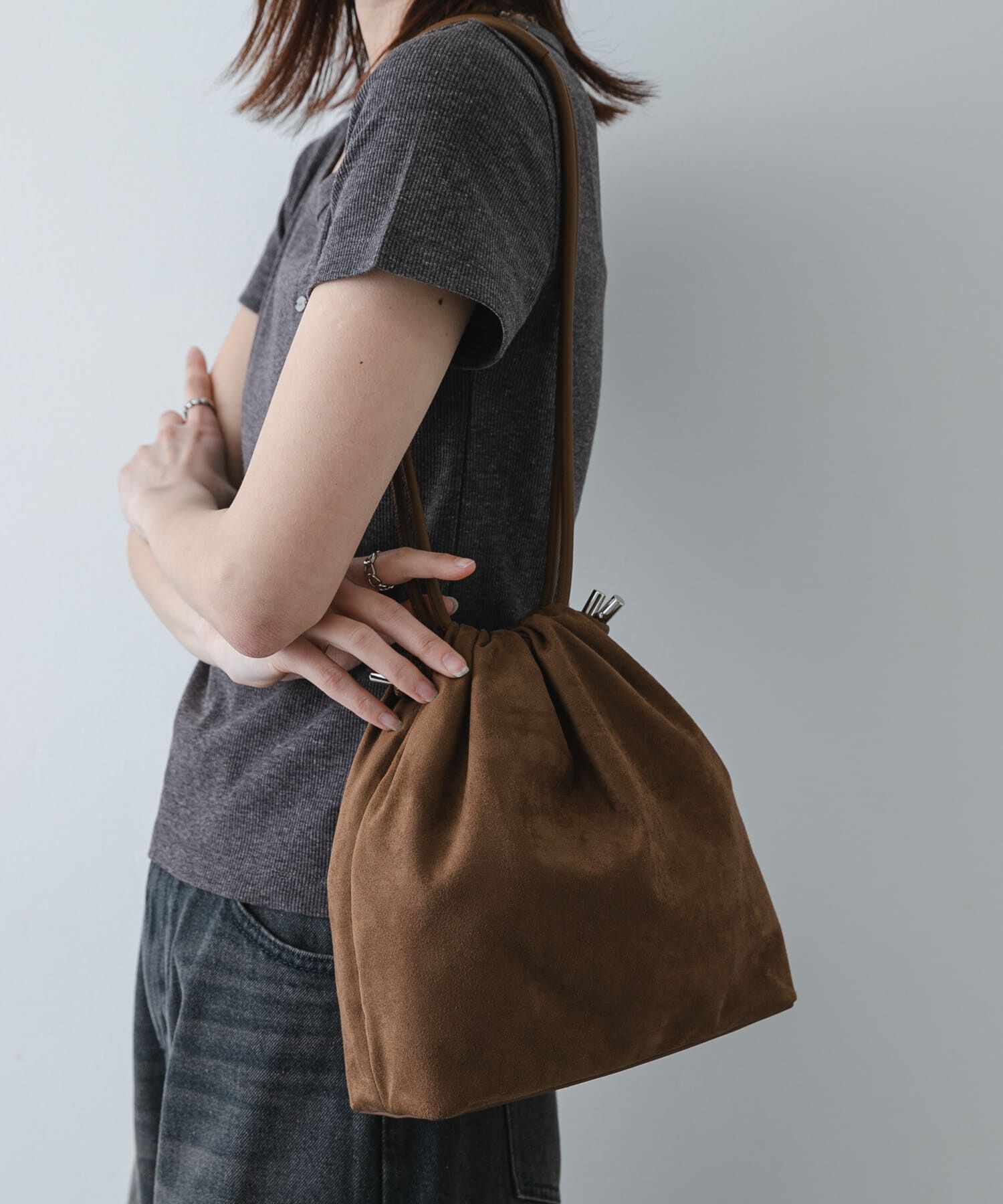 【フォルムを楽しむ。マルチハンドル巾着バッグ】・しっとりとしたフェイクスウェードと、なめらかで柔らかいフェイクレザーの2つの質感から選べるアソート展.. |