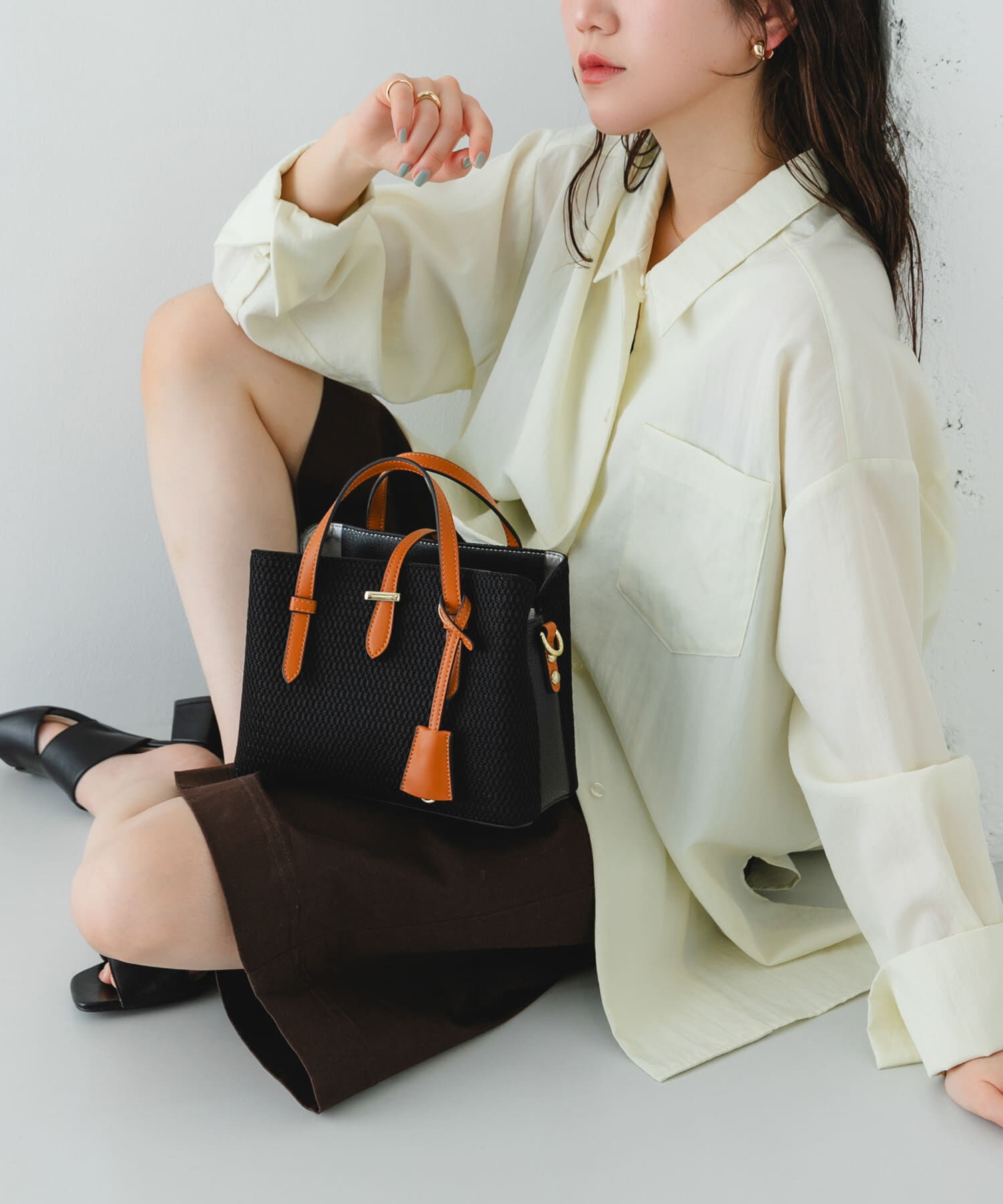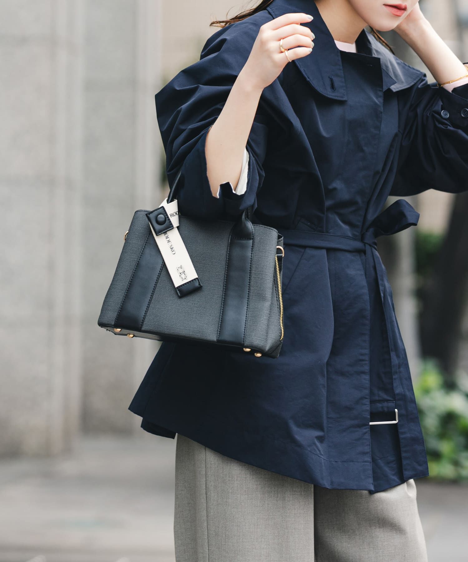 お仕事シーンで活躍するきれいめバッグ【Material】合皮を使用【Design】バッグ本体とバイカラー配色のチャームが付いたハンドバッグ。バッグ内部は3層に分か.. |