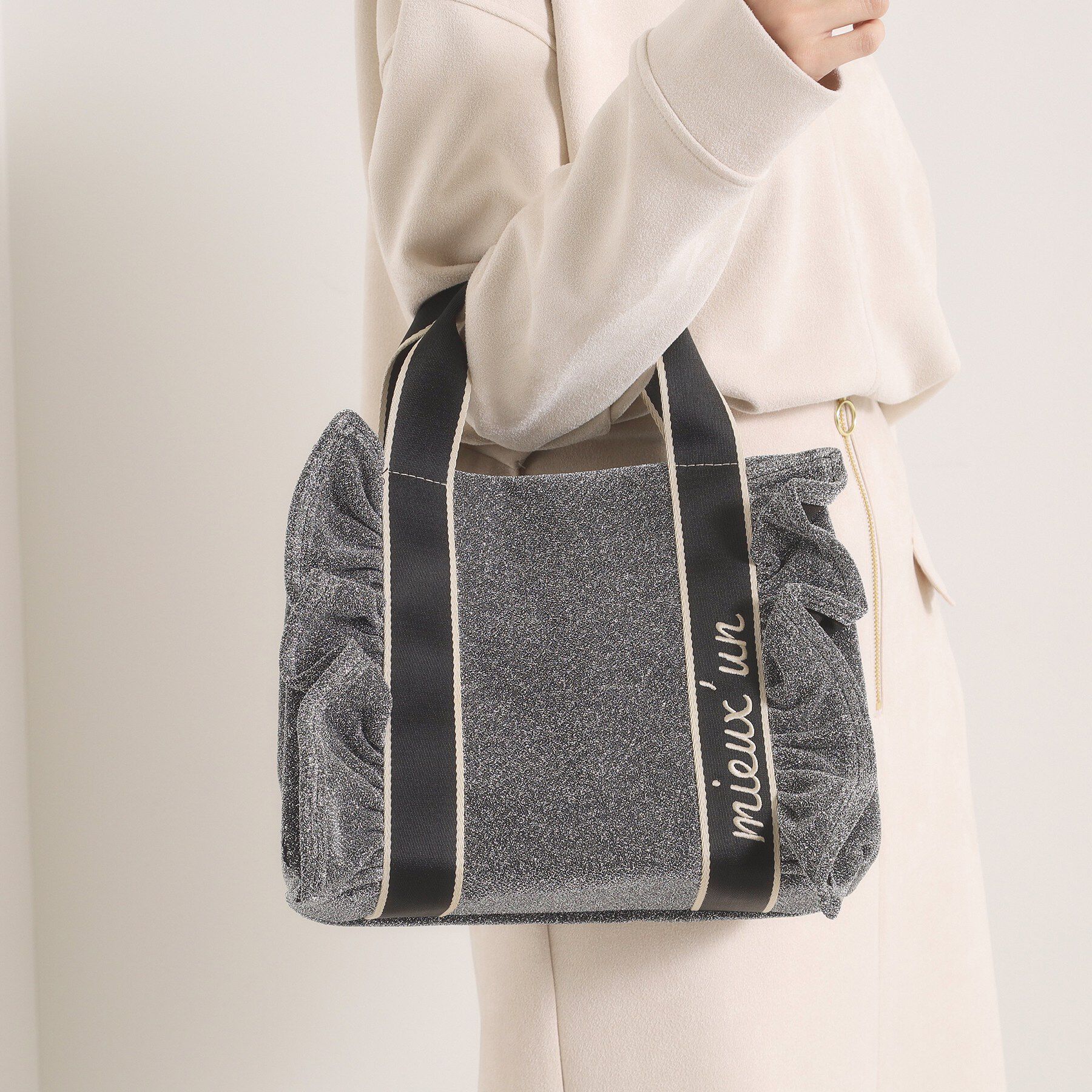 【デザイン】ふんわりとしたフリルをサイドにあしらい、カジュアルながらフェミニンな印象のミニトート。キラッと華やかなシルバー、ブラックと、落ち着いたベ.. |