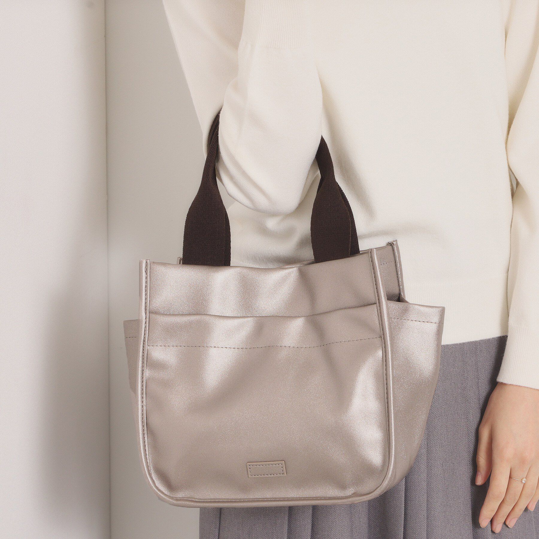 【デザイン】収納上手なミニトート。なめらかな合皮素材でモードに仕立てたスクエアフォルム。シンプルながら程よい存在感でデイリーコーデに馴染みます。3色.. |