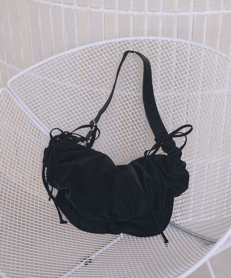 大きめリボンが特徴のショルダーバッグトレンドのクシュっとしたシャーリングデザインが印象的なクロワッサン型のショルダーバッグ。ナイロン素材で荷物もしっ.. |