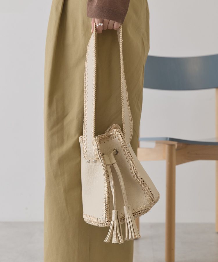 品のある合成皮革を使用した人気の巾着型バッグ。ベーシックなワントーンカラーにかがりステッチを施したさり気ないクラフトディテールが魅力です。幅広のワン.. |